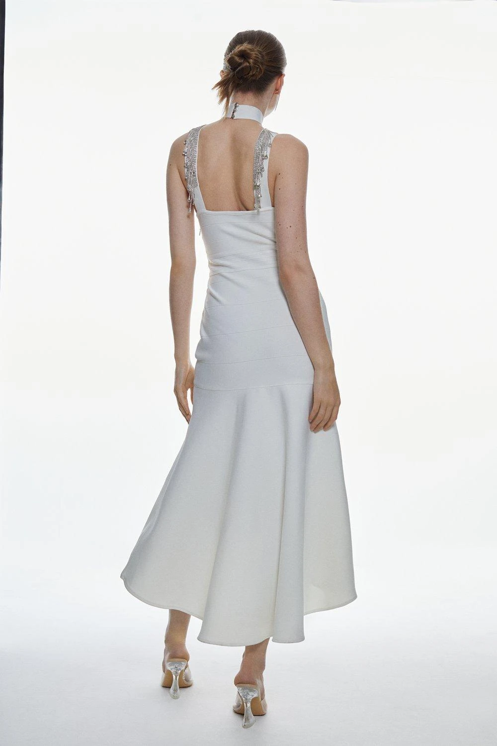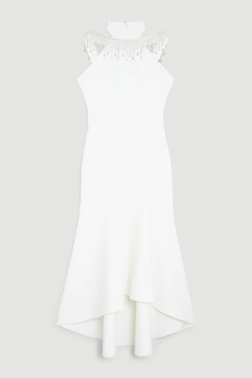 Elegant yet decidedly glamorous, this midi dress promises to make an unforgettable impression at any occasion. Drop diamante crystals make an instant statement, while a high halter neckline adds a sophisticated mood. A fishtail skirt finish the piece with a final flourish.