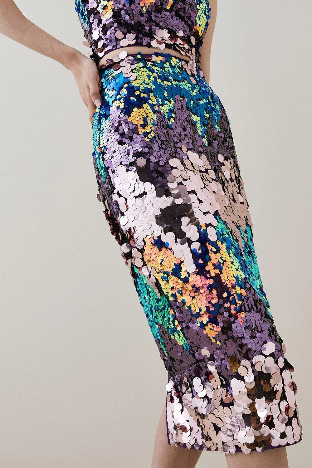 Emanate a celestial allure in this statement sequin skirt. All-over sequin embellishment makes this piece a real showstopper, perfect to wear for a night of endless dancing. The skirt drapes down below the knee, creating a tasteful and flattering fit. Style with the coordinating top for an unstoppable ensemble.