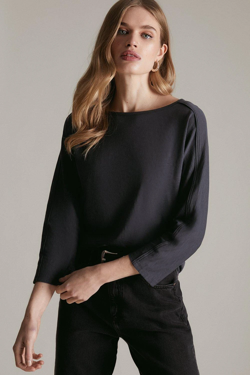 Every well-curated collection needs a classic jersey tee. Crafted from lightweight cotton that drapes over the body for a luxe finish, it has an elegant bateau neckline, dropped shoulders and mid-length sleeves that can be styled to showcase a stack of gold bracelets. Landing at a cropped hem, pair this tee with high waist leather trousers or denim jeans for timeless simplicity.