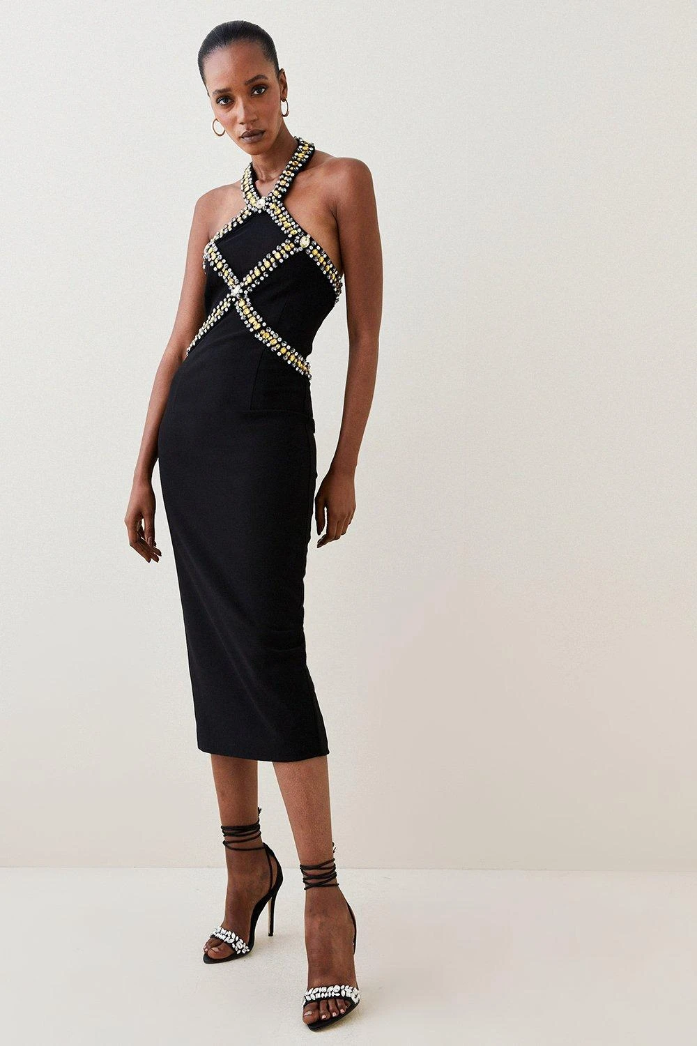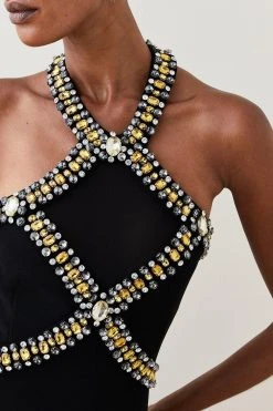 A classic style emblazoned with jewel details, this halter neck dress promises to add a drop of decadence to your occasionwear wardrobe. The bodice and neckline are adorned with hand-embellished claw crystals, creating a glamorous illusion, while form-hugging material sculpts the silhouette.