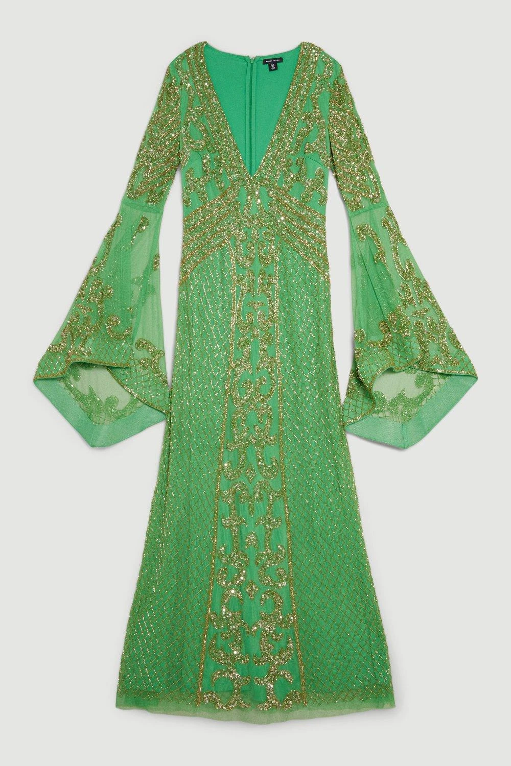 Grown-up glamour, guaranteed. Combining statement kimono sleeves with a feminine silhouette, this beaded maxi dress makes a glamorous mark at special occasions. The plunging V-neck bodice complements thousands of sparkling embellishments and a subtly flared hem.