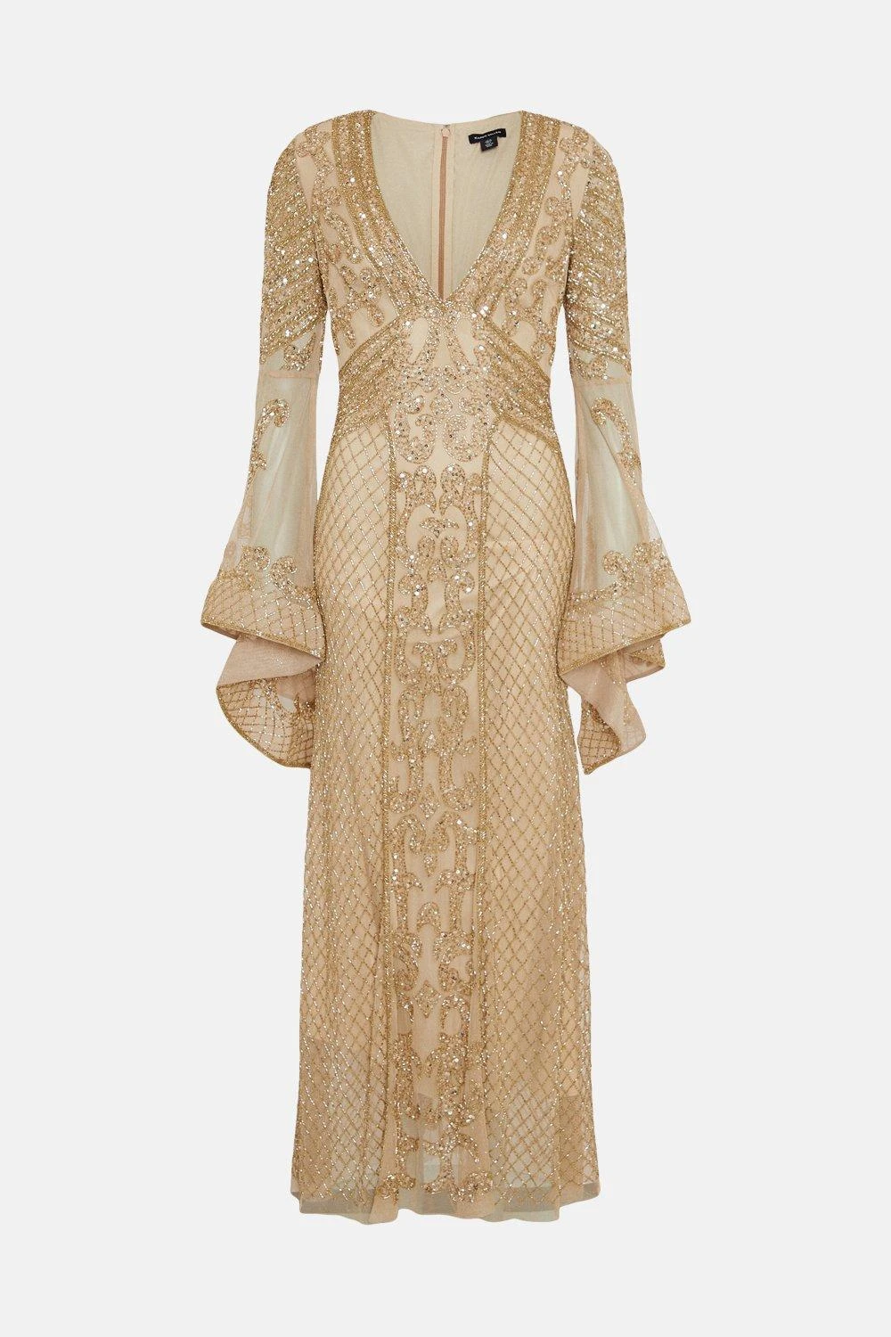 Grown-up glamour, guaranteed. Combining statement kimono sleeves with a feminine silhouette, this beaded maxi dress makes a glamorous mark at special occasions. The plunging V-neck bodice complements thousands of sparkling embellishments and a subtly flared hem.