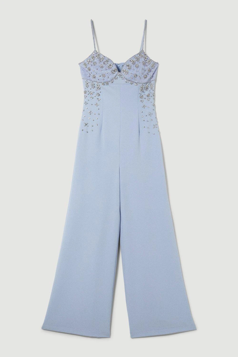 Adorned with gleaming claw crystals, this elegant jumpsuit is the perfect addition to your occasionwear collection. Wide leg trousers ensure a flattering fit, while a lace bodice adds a classic touch.