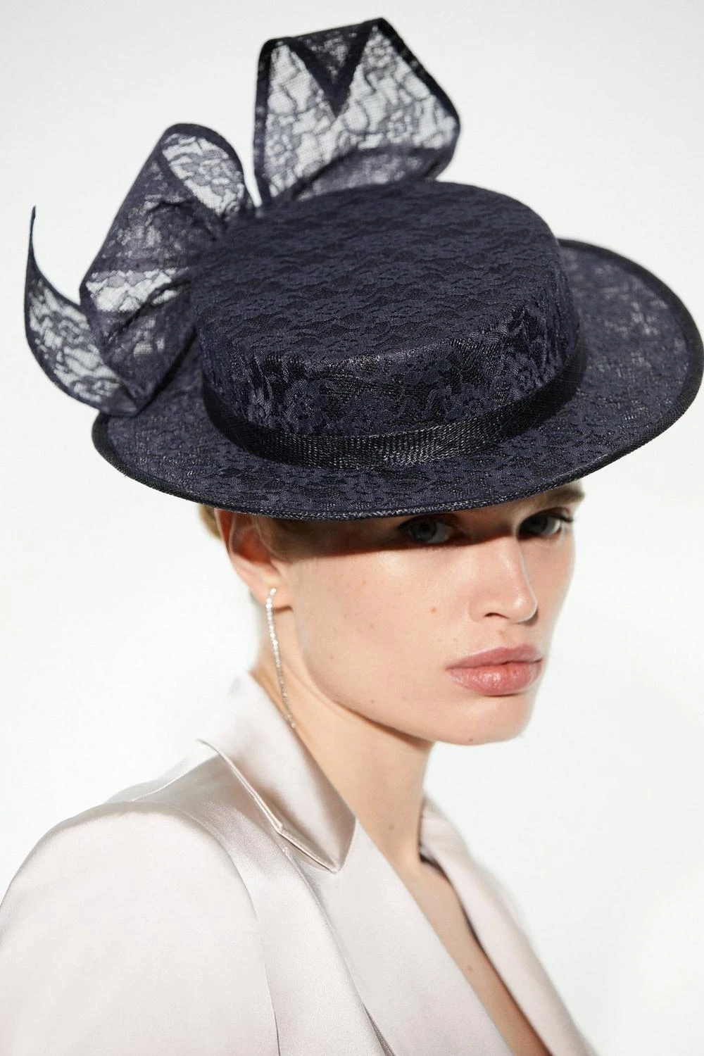 Exude confidence in this impactful boater hat. Delicate lace details infuse this piece with undeniable elegance, while a statement bow design adds a glamorous finish. Style this hat with a suit co-ord or tailored dress for a sophisticated occasion ensemble.