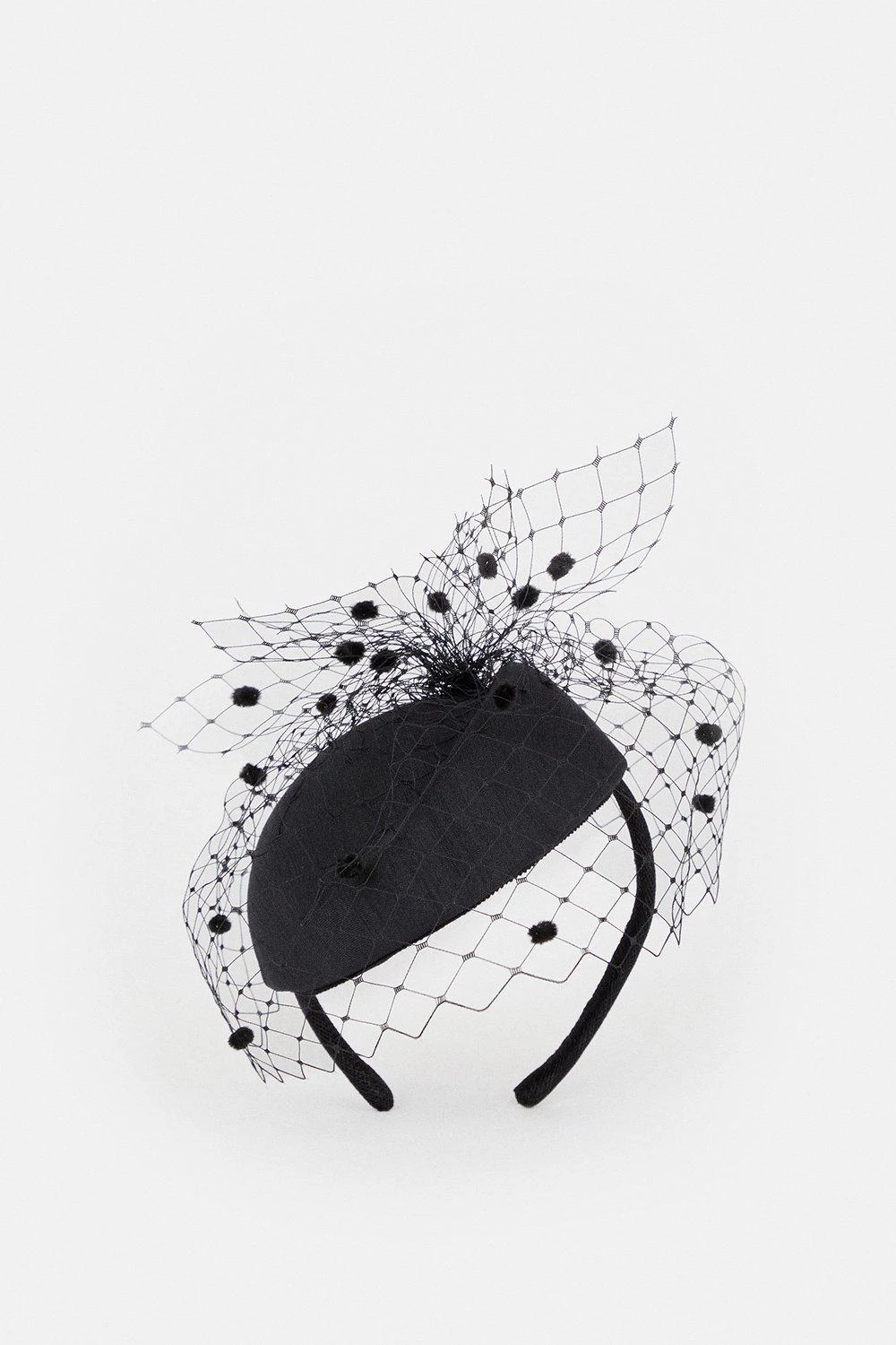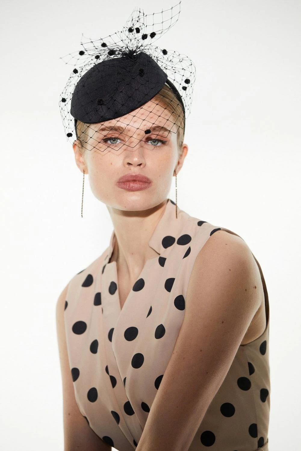 Exude a vintage-inspired aesthetic in this classic fascinator. Taking inspiration from the 1930s, this percher-style pillbox headpiece exudes undeniable elegance, while polka dot veiling adds a subtle playful touch.
