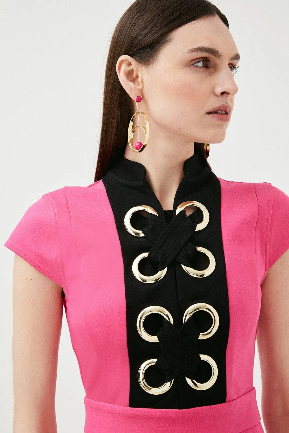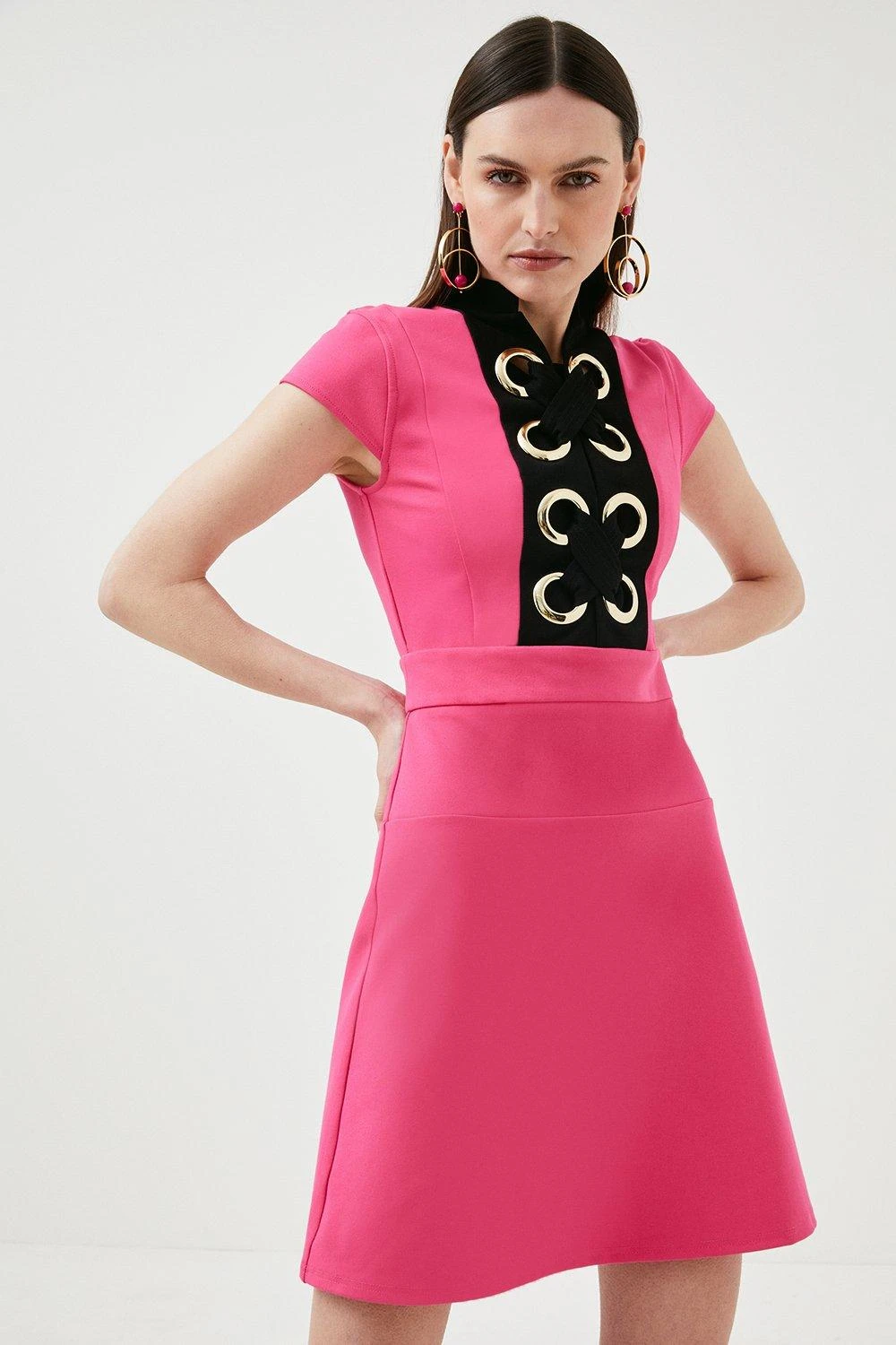 Boldly finished with an oversized eyelet trim across the chest, this jersey dress is cut in an A-line fit as an effortlessly flattering design. Collared at the neck, it features a cap sleeve on the arms, is panelled at the back and secured with a hidden zip. Pair with Mary Jane shoes as a timeless combination.