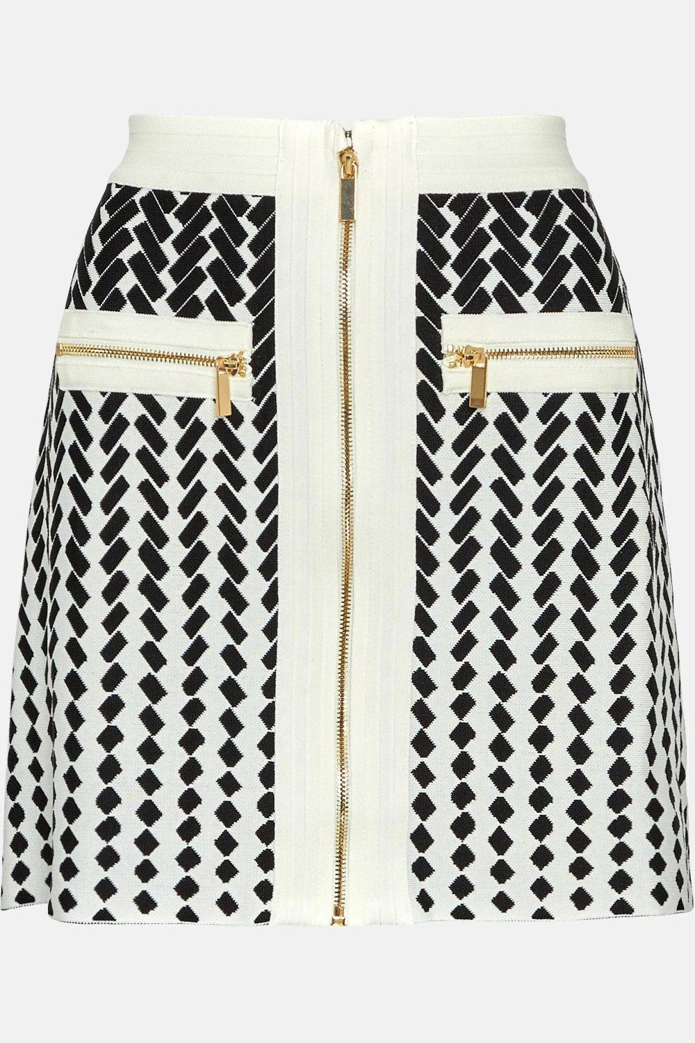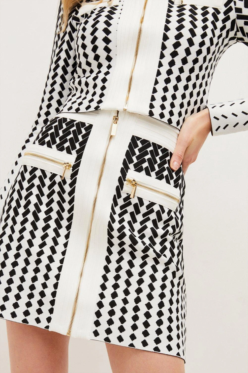 A retro skirt with endless seasonal appeal. This geometric jacquard design comes crafted from our signature bandage fabric for a stretchy, curve-skimming fit and features a full-length gold zip and matching zipped pockets. Sitting high up on the waist to amplify its leg-lengthening potential, it makes a modern match for the coordinating zipped jacket and sky-high heels.