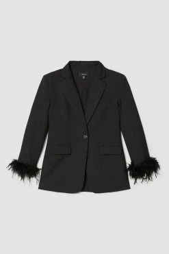 Blurring the lines between feminine allure and structured edge, this single-breasted blazer makes an opulent addition to your workwear wardrobe. Defined with clean-cut lines and strong shoulders, the feather-trimmed cuffs add a playful element. Pair this blazer with co-ordinating trousers for the perfect desk-to-dinner ensemble.