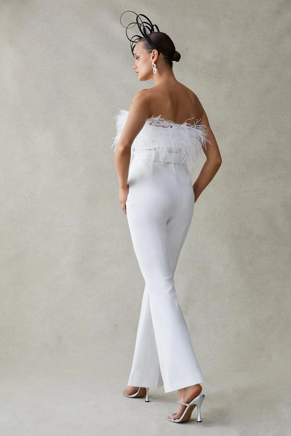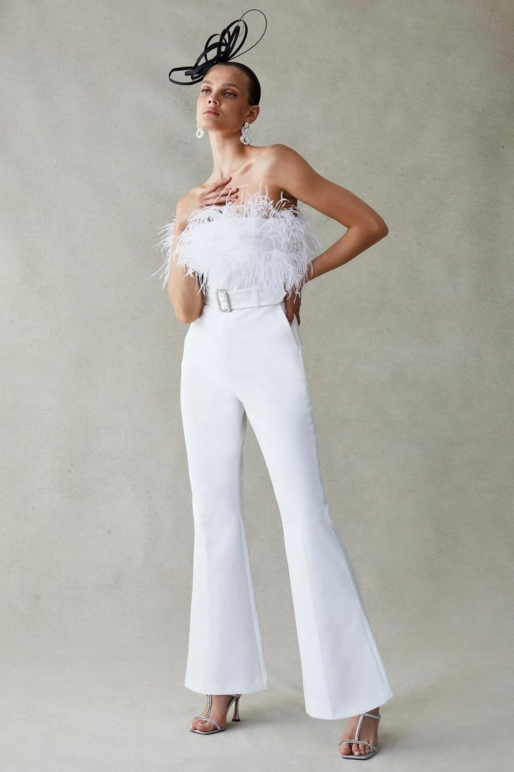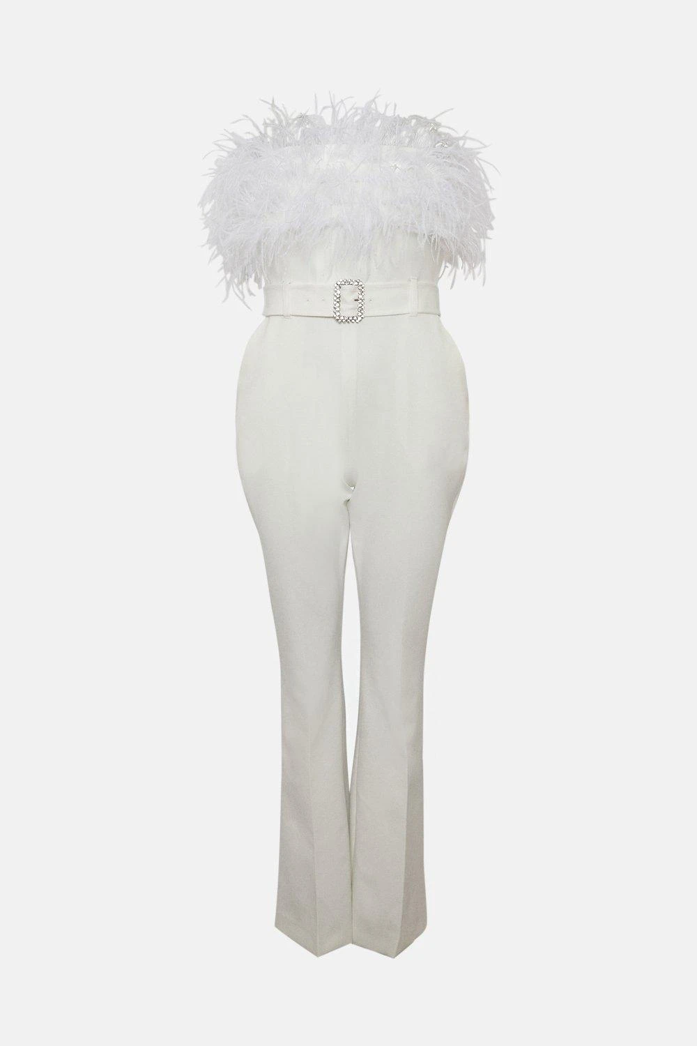 Bringing disco-ready drama to your next special occasion, this tailored jumpsuit features a flurry of feathers framing the bandeau bodice. Fastened with an opulent crystal buckle at the waist, it effortlessly defines your figure, draping down to flared, wide-leg trousers for a final modern flourish.
