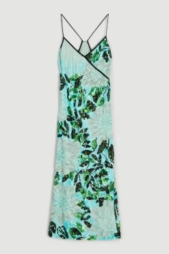 Blending exquisite craftmanship with a mesmerising colour palette, this striking cami dress is guaranteed to stand out at special occasions. The entire garment is detailed with light-catching sequins, creating a captivating botanical illusion.