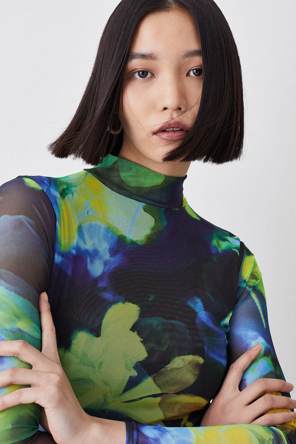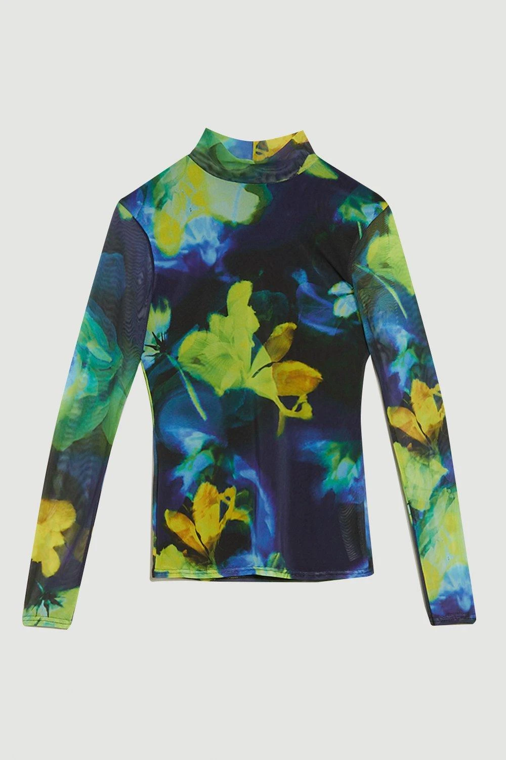 Evocative of an optical illusion, this top is enlivened in vibrant blue hues and a magnetised floral print. The mesh composition adds an element of allure, while long sleeves and a high neck add sophistication.