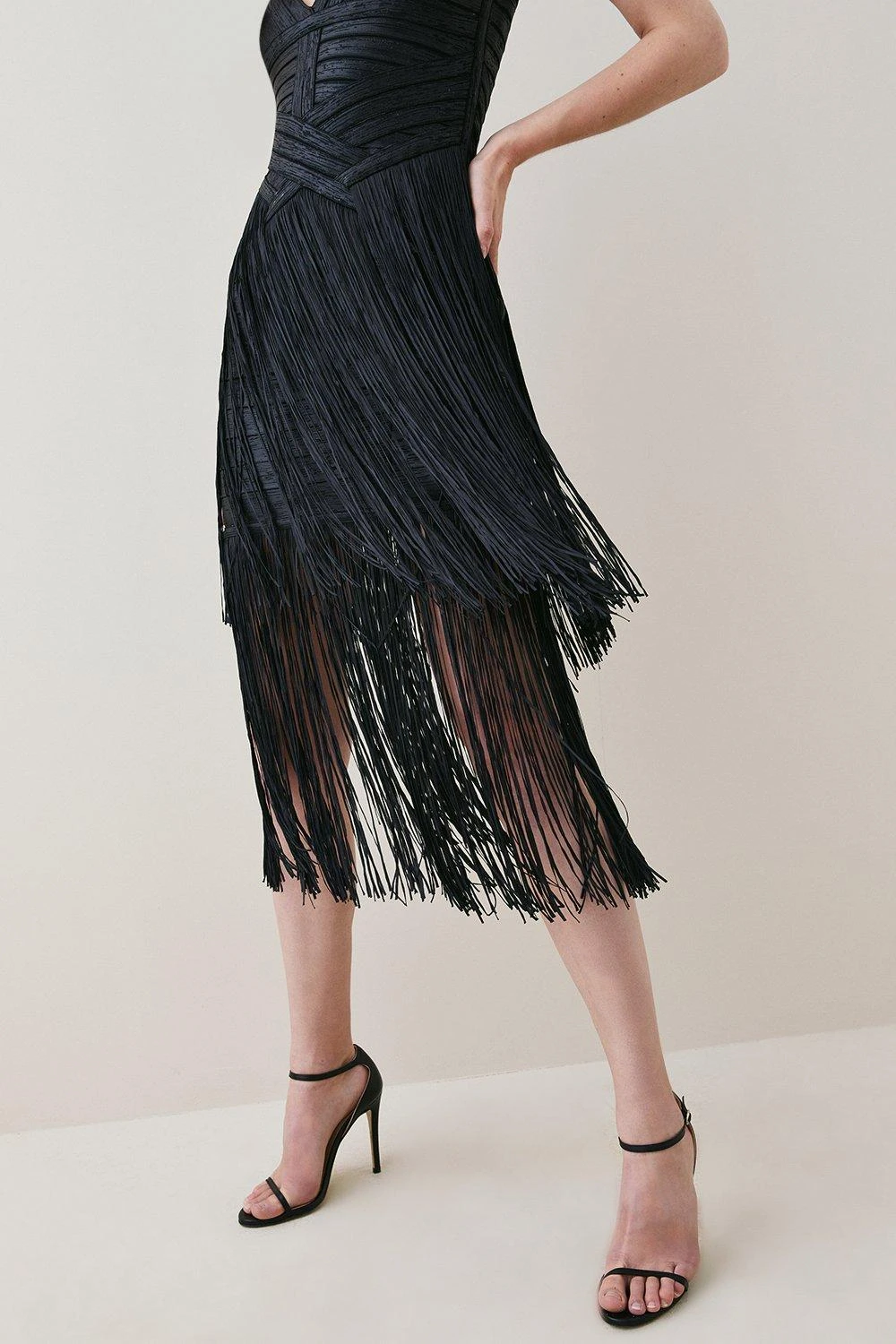 Structured with masterful aplomb, this bandage midi dress is enlivened with rich dimension. Offsetting the close construction, it lands at a playful tasseled skirt that moves with inspired luxury.