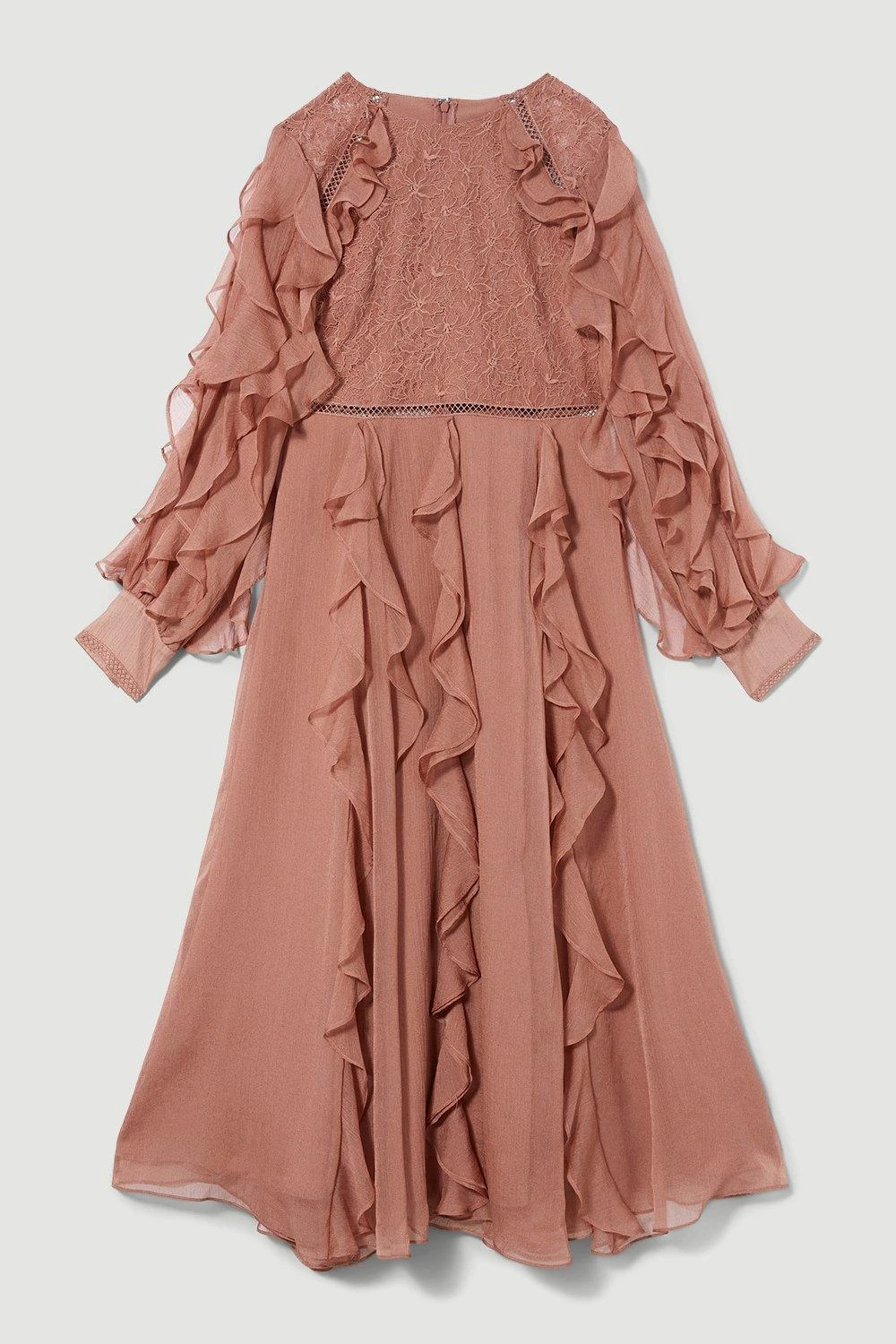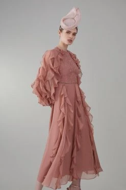 A feminine piece with artisanal flair, this dress features rippling ruffles that sway elegantly with every step. The bodice features intricate lace details, which contrasts beautifully with the frill sleeves. Style this dress with metallic heels and a matching fascinator for a captivating race day or wedding look.