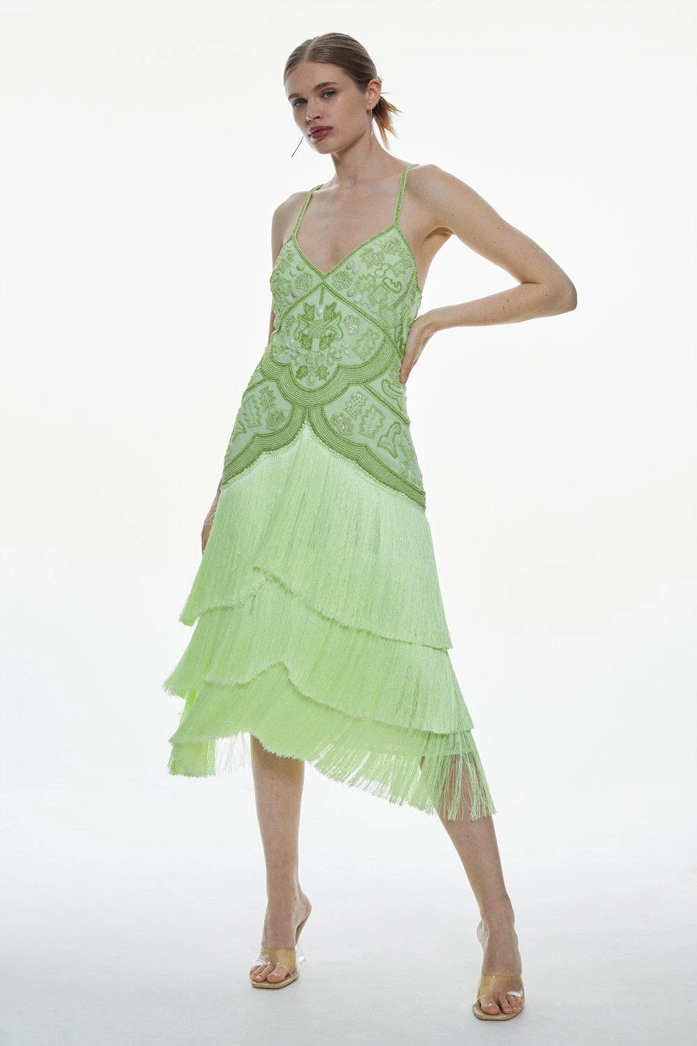 Intricate beads and dramatic tiers of fringing add an opulent, Art Deco twist to this statement midi dress. Rippling beautifully with every move, this decadent dress naturally calls to celebratory occasions.