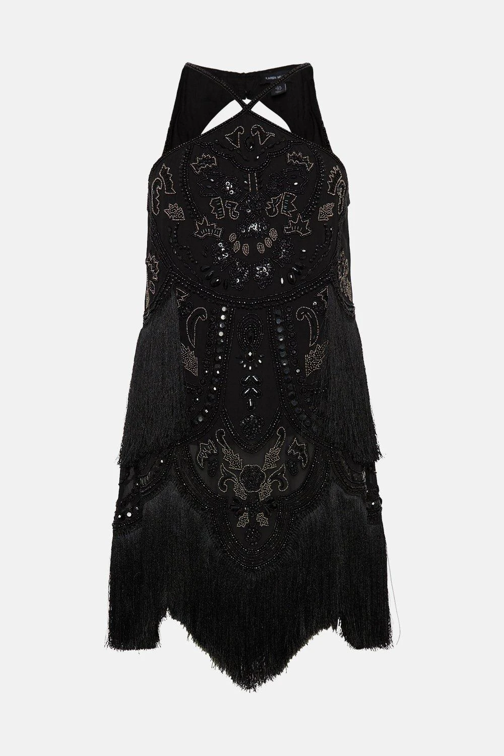 Your shortcut to high-voltage summer styling, our fringed black halter dress adds an undeniable sense of glamour to sunset cocktail hour. Combining intricate beading with glamorous tassels that swish as you stride, this statement mini dress is sure to turn heads. It features a modern back cut-out to frame sun-kissed shoulders along with an asymmetric hem for a beautiful sense of movement.