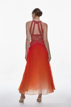 Drenched in flaming hues of scarlet red and vibrant orange, this maxi dress encapsulates the heat of summer. Gold embroidered details infuse this piece with undeniable glamour, while a pleated skirt ensures an elegant silhouette. Style this piece with heels and accessories for a standout occasionwear ensemble.