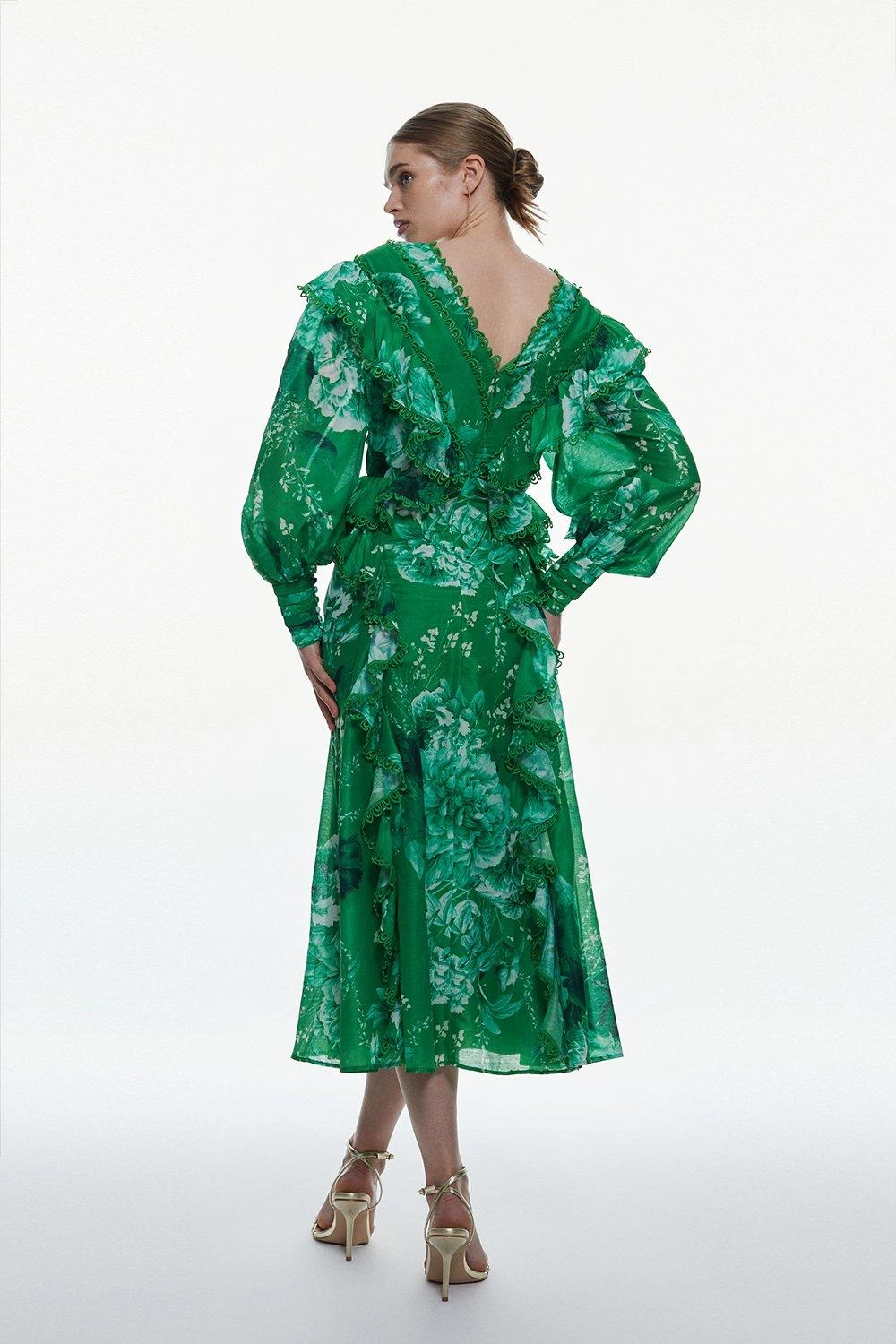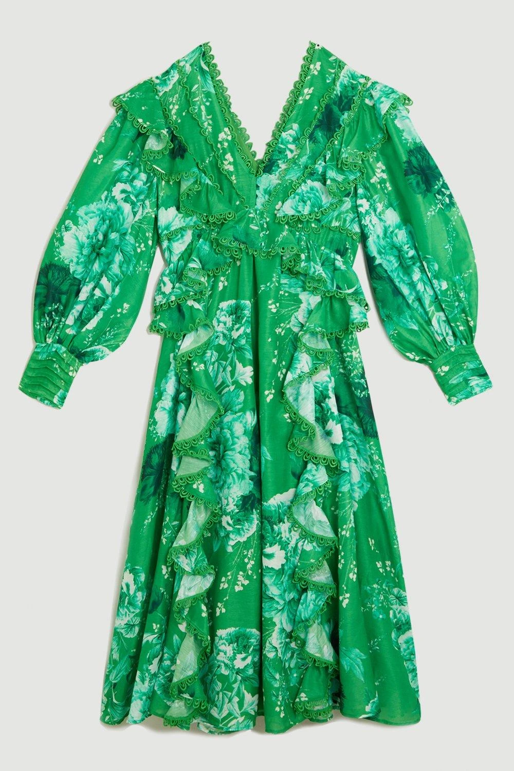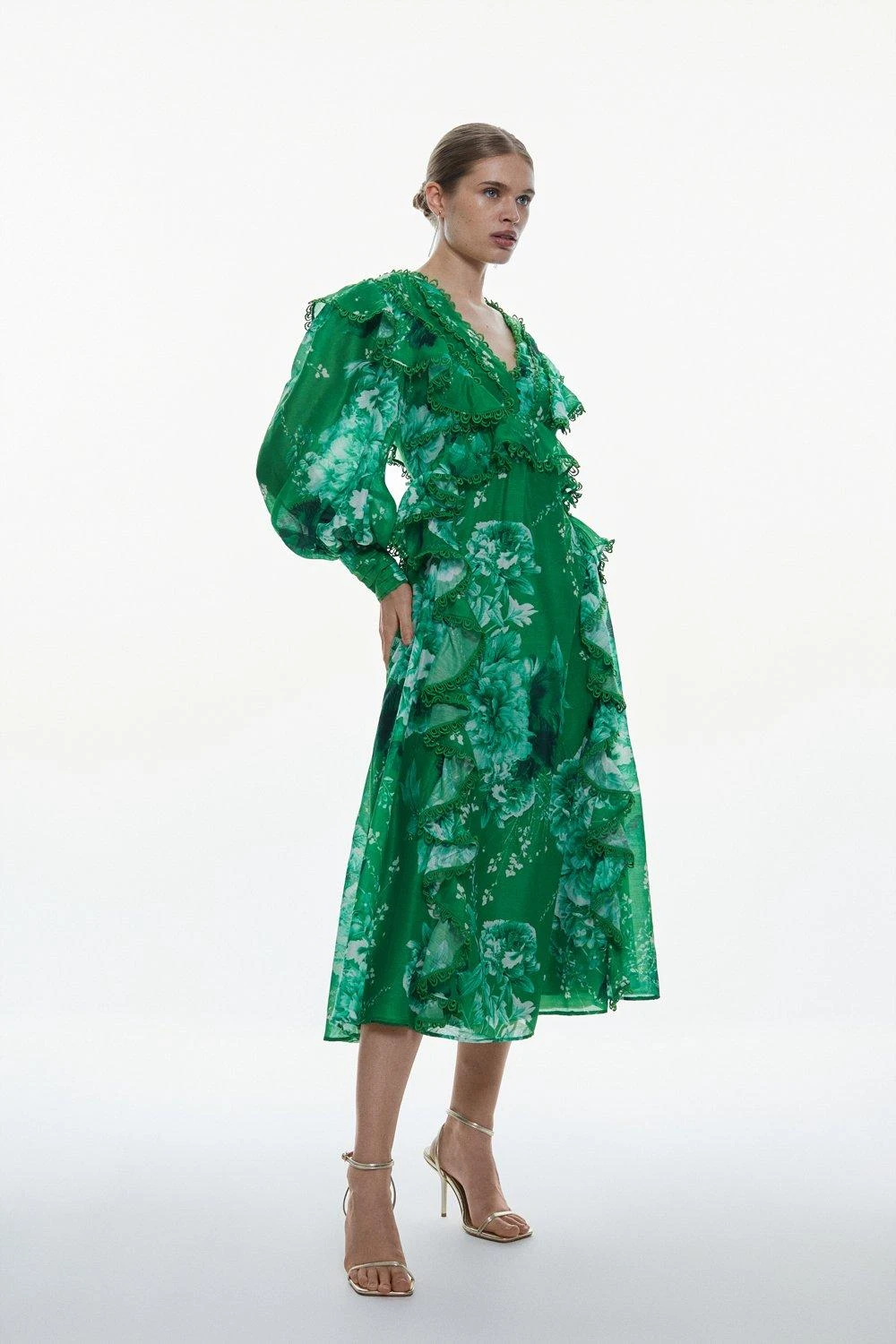 Crafted with striking hues and a vivid floral print, this maxi dress perfectly captures a summer aesthetic. Lace trim details and balloon sleeves add an authentic, classic feel to the piece, while ruffled skirt creates a romantic mood. Style this piece with heels or sandals to curate an unforgettable warm-weather ensemble.