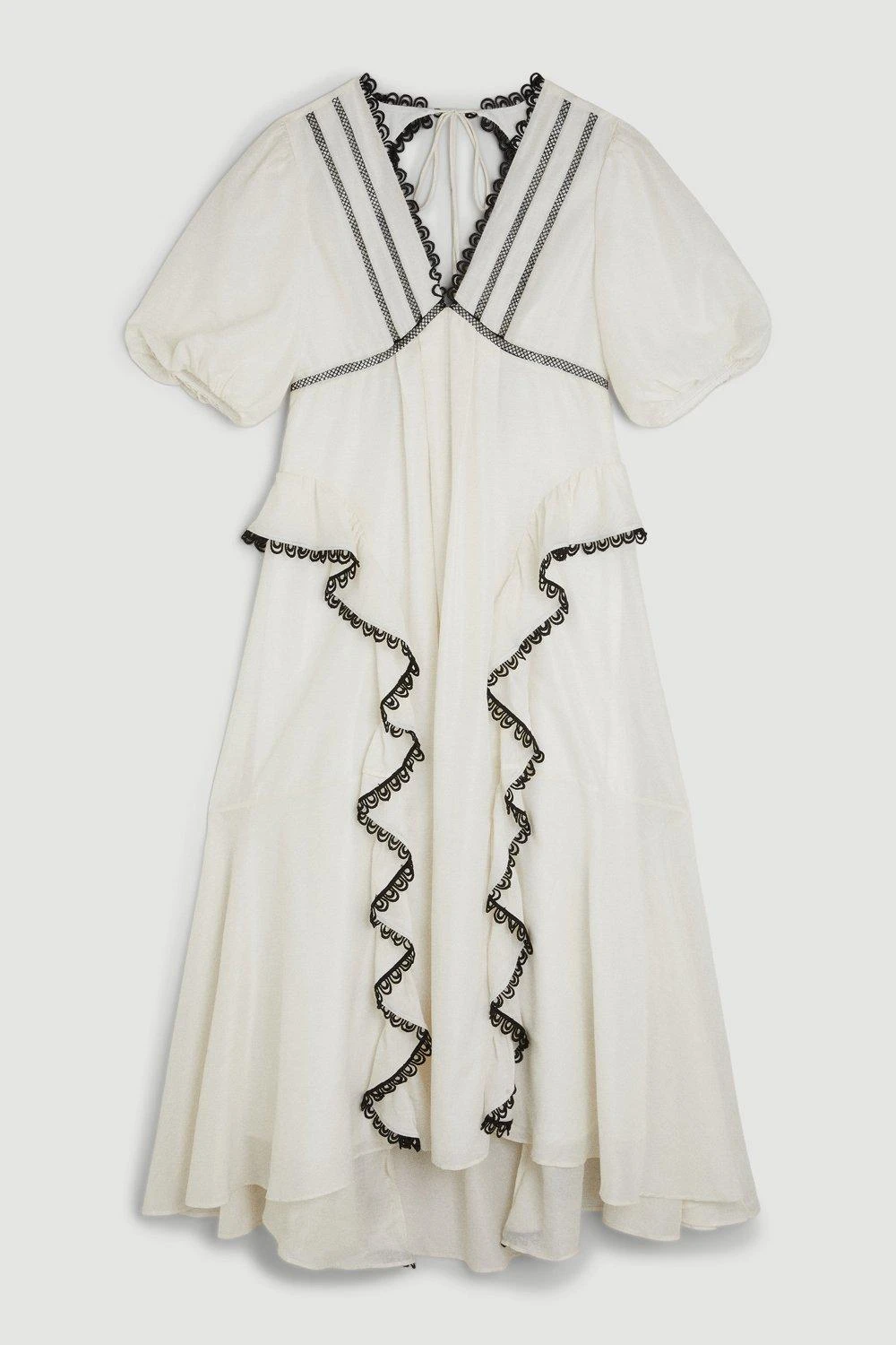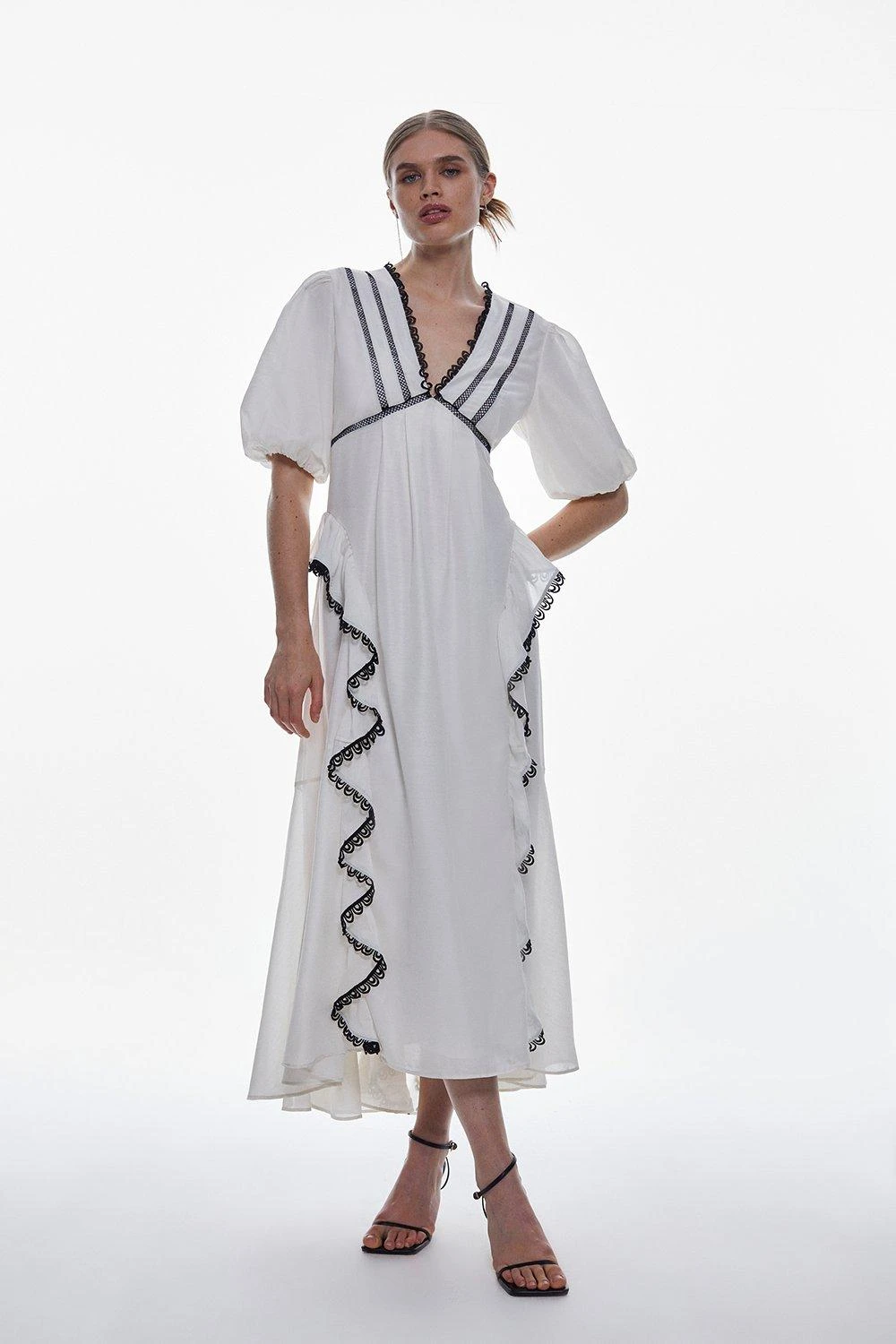 This romantic design can be styled for both everyday and special occasions. Puff sleeves create a flattering effect, while ruffle lace details add a whimsical feel. Pair this maxi dress with either sandals or heels.