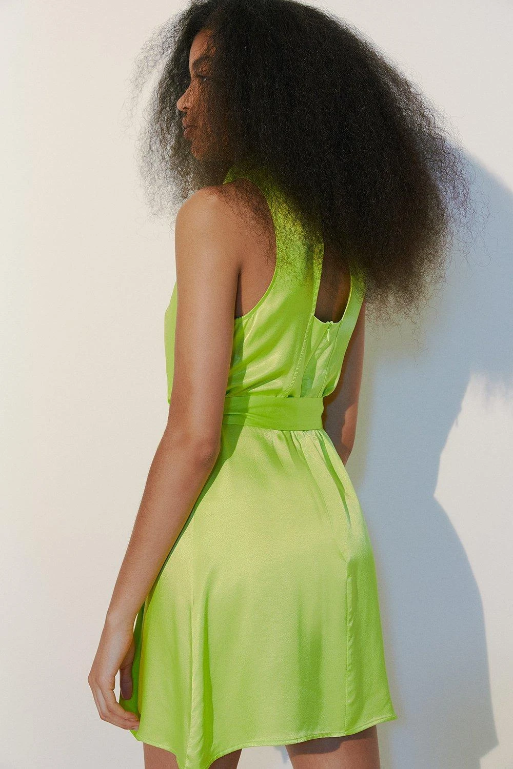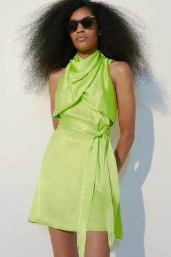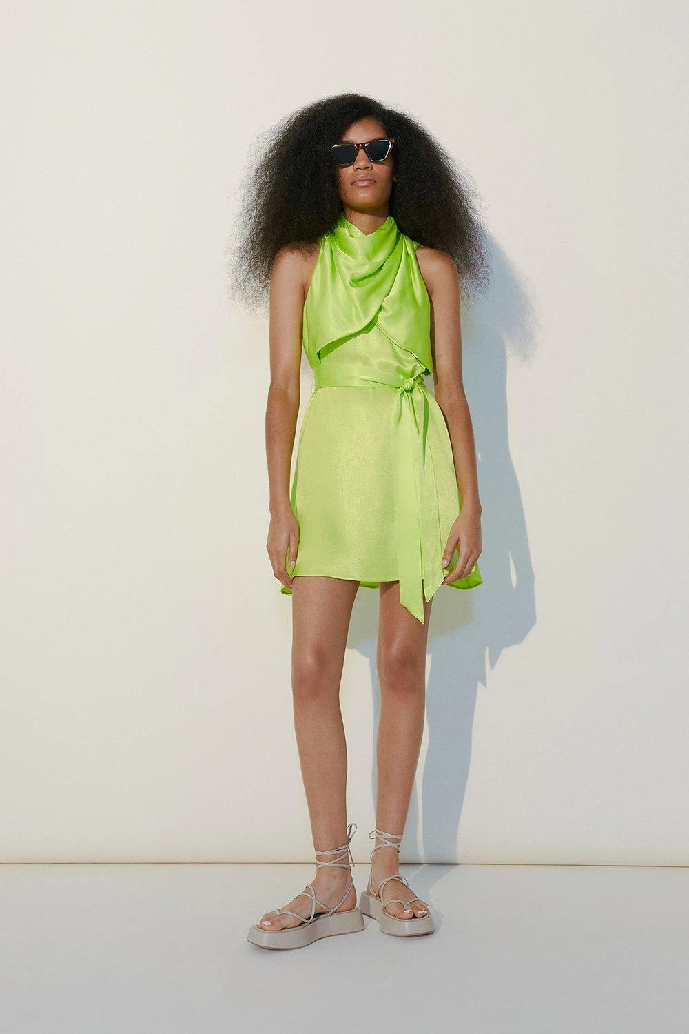 The summer mini dress, but not as you know it. Crafted from luxe draped satin, this unique piece shows off glamorous gathers framing the bust along with a knotted waist belt and flirty mini skirt. The liquid-like fabric makes it perfect for balmy days, whilst a sultry back cut-out only adds to its summery allure.