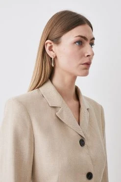 Main: 47% Polyester, 27% Linen, 25% Viscose, 1% Elastane. Lining: 100% Cotton. Dry clean only. Model wears UK 8/US 4. Model height: 5”9. Length measurement: 82cm.