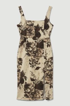 Crafted with a premium Italian metallic jacquard fabric, this pencil dress is the epitome of luxury. It features an intricate floral print designed by the in-house Karen Millen team, and can be styled for a wedding guest outfit as well as a race day look.