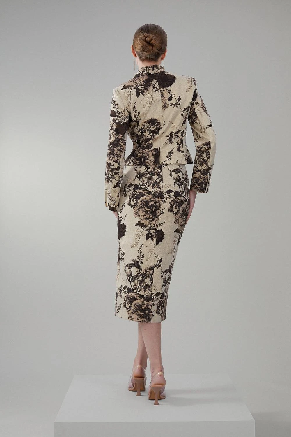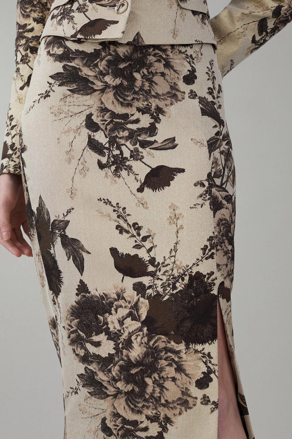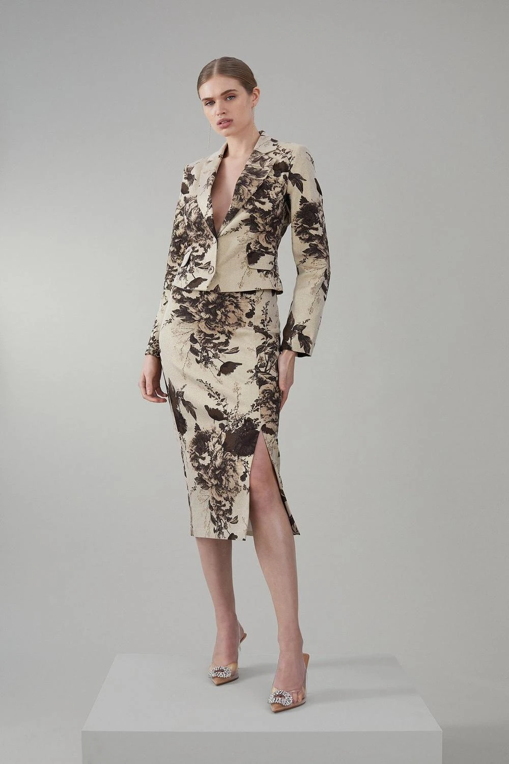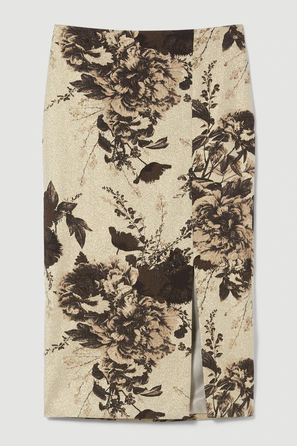 This skirt is crafted from Italian metallic jacquard material and features an intricate floral print designed by the in-house Karen Millen team. Style this piece with the matching jacket and outfit this co-ord from now through to the summer months. Plus, achieve maximum style potential by using as smart-casual separates.