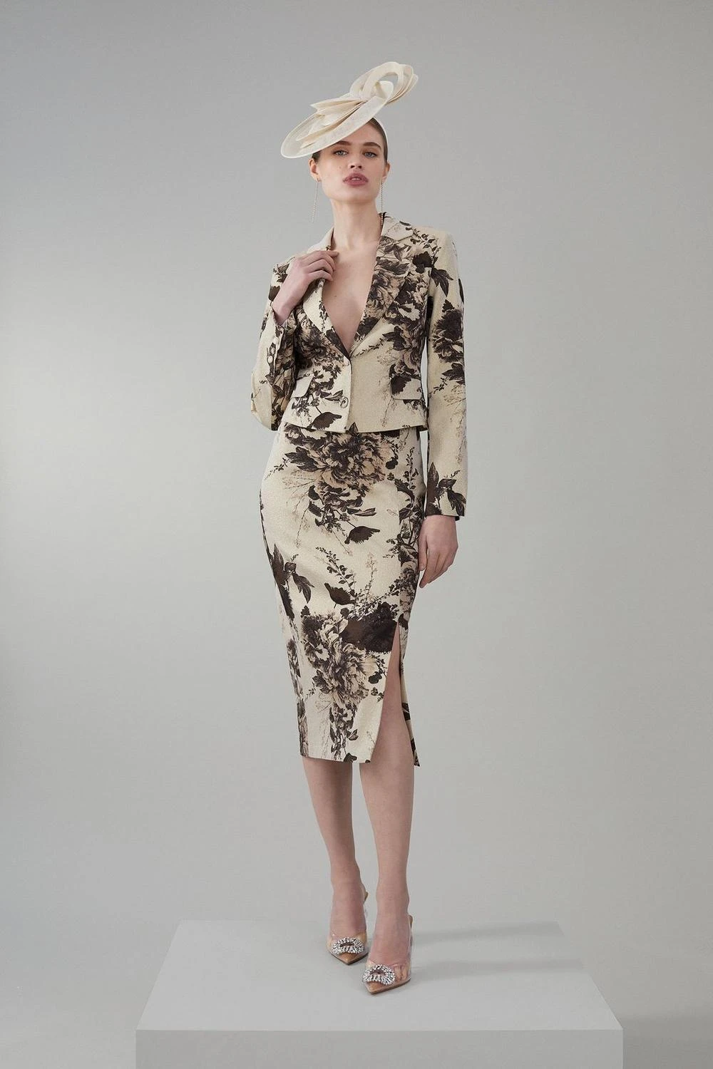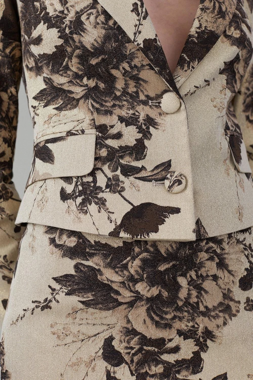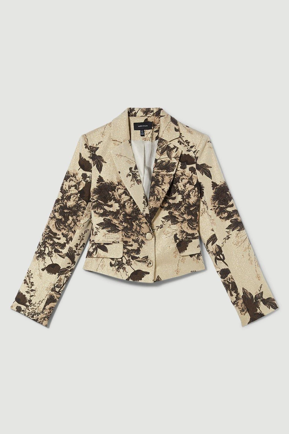 The epitome of luxury, this tailored jacket is crafted with an Italian metallic jacquard material, and features a floral print designed by the in-house Karen Millen team. Notched lapels give classic appeal, while a plunging neckline adds a contemporary touch. Pair this piece with the matching skirt and outfit this co-ord from now through to the summer months. Plus, achieve maximum style potential by using as smart-casual separates.​