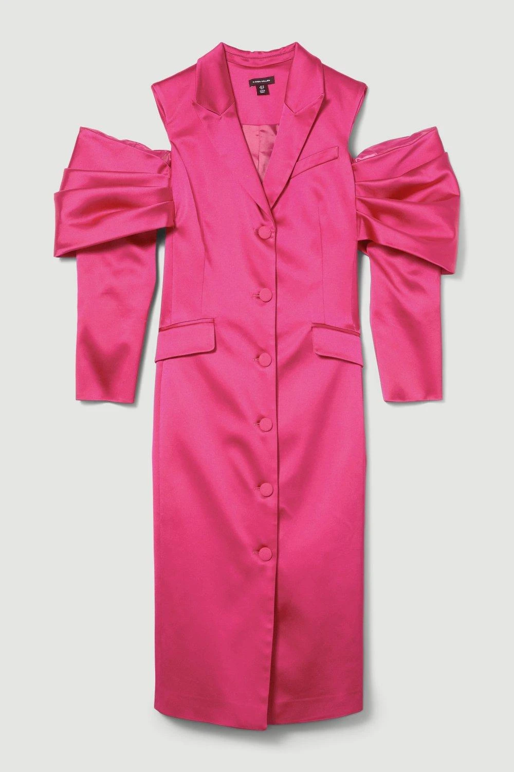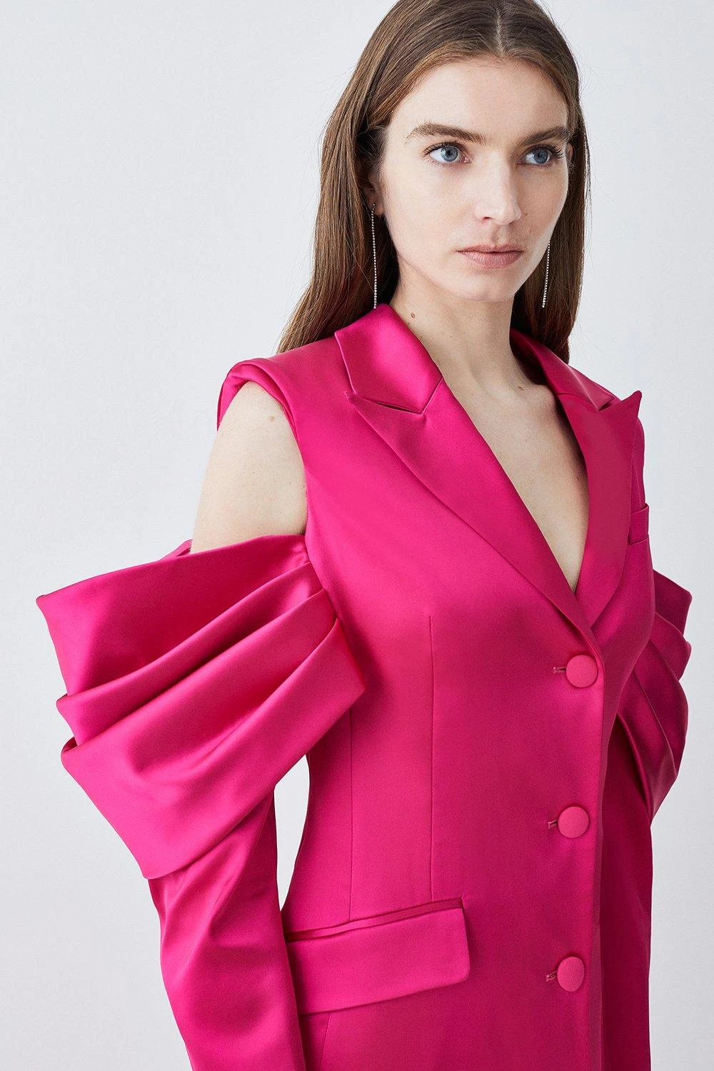 This Italian structured satin dress provides a contemporary take on classic occasionwear. Notched lapels and flap pockets nod to traditional tailoring, while a cut out, tiered sleeve detail adds a dose of drama to the piece. Fabric-clad buttons uphold the smooth, streamlined design, while a plunging neckline adds a sultry effect.
