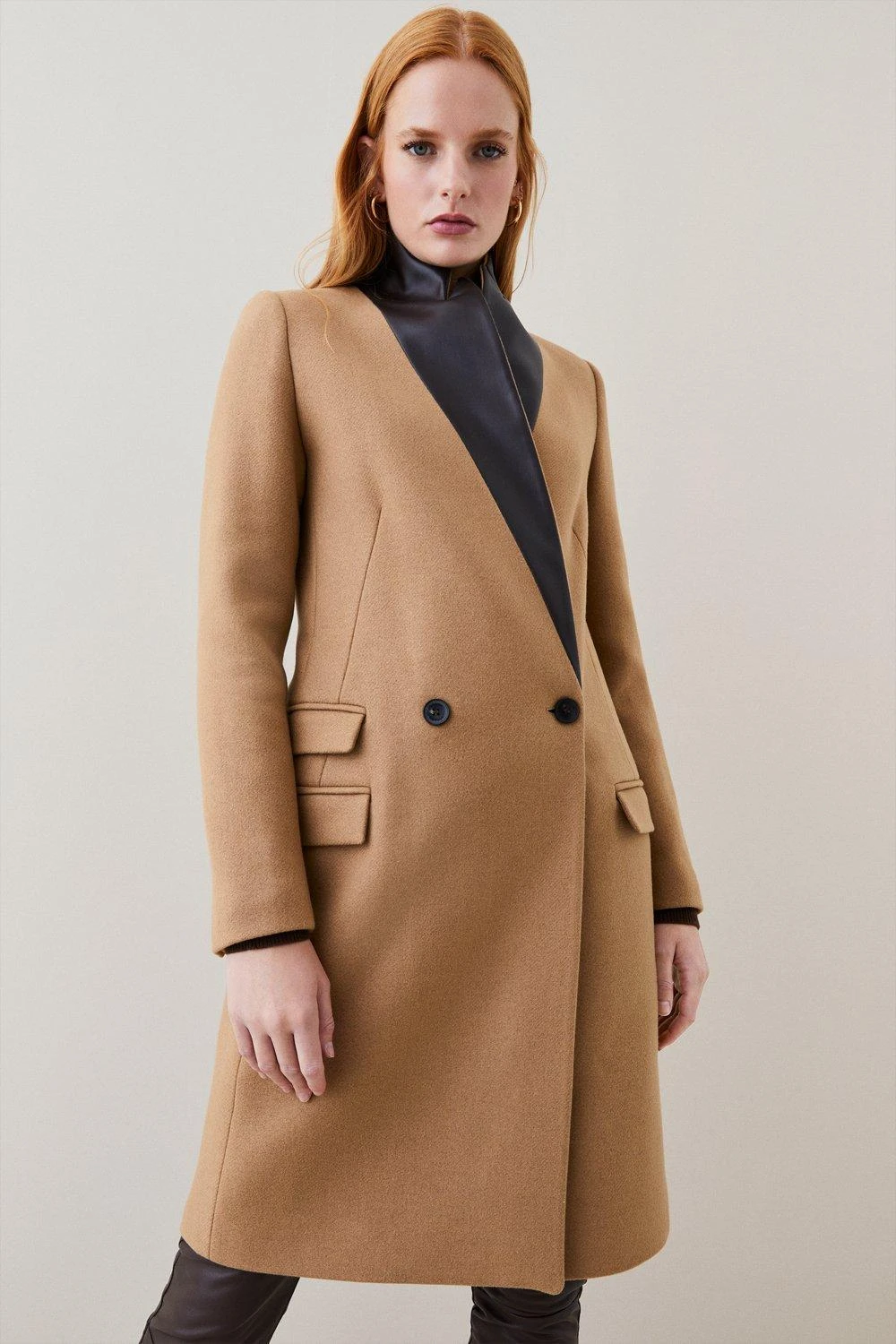 Spun from the revered quality of our Italian virgin wool, the classic double-breasted silhouette is updated with the contemporary addition of faux leather lapels. Boasting timeless characteristics, stay warm with layers of cashmere and matching leather pants.