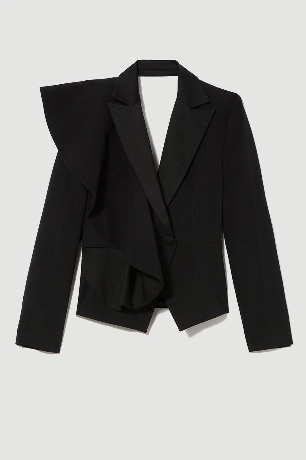 This piece masters shape and structure with a fashion-forward aesthetic. The sharp and classic design is elevated with a statement ruffle detail, while an open-back detail adds a sultry element. Satin material provides a lustrous sheen.