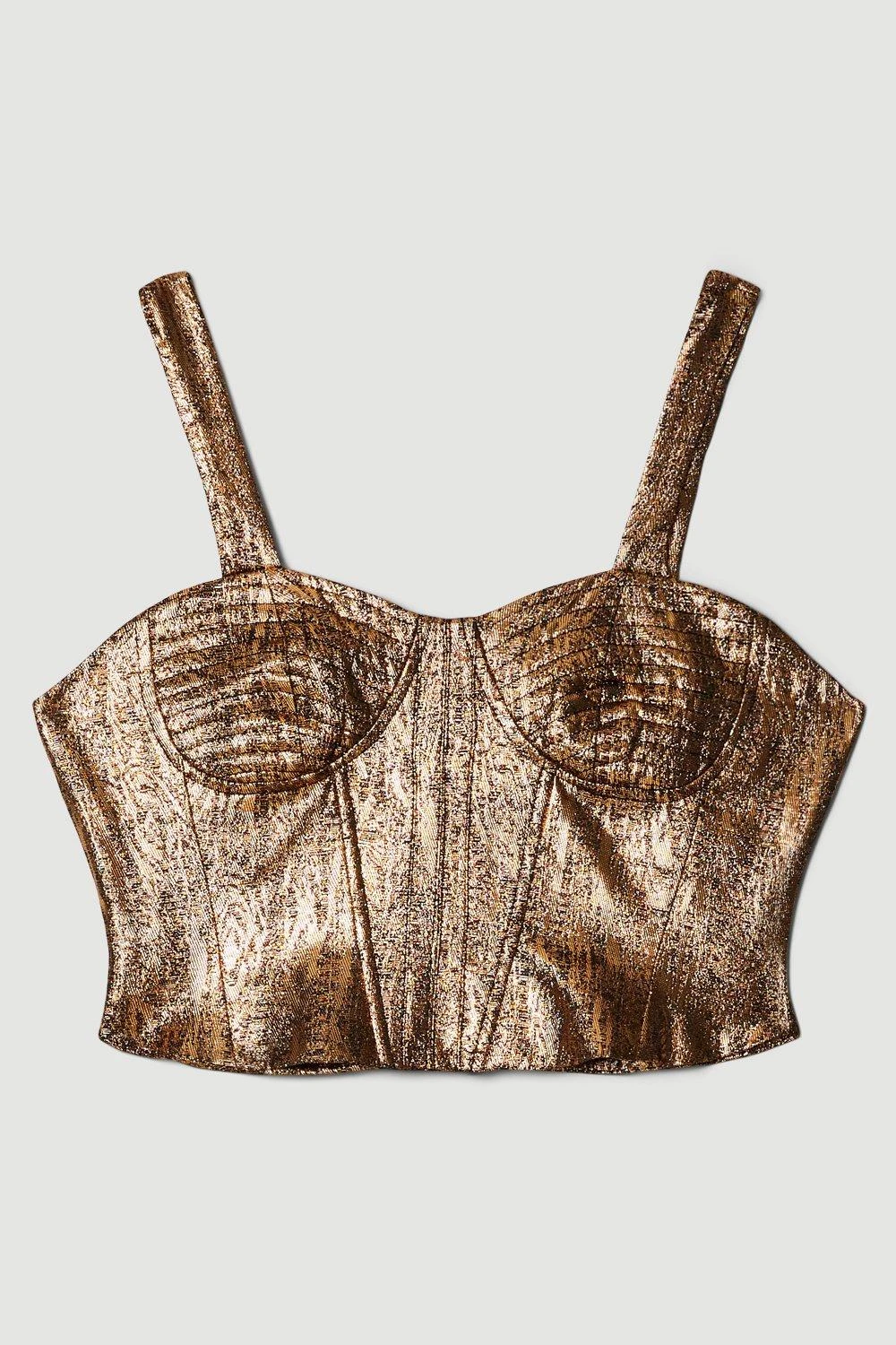 Leave a lasting impression with this structured corset top. Appearing in marble-inspired jacquard, this form-fitting piece is detailed with fixed cups and contrast topstitching.
