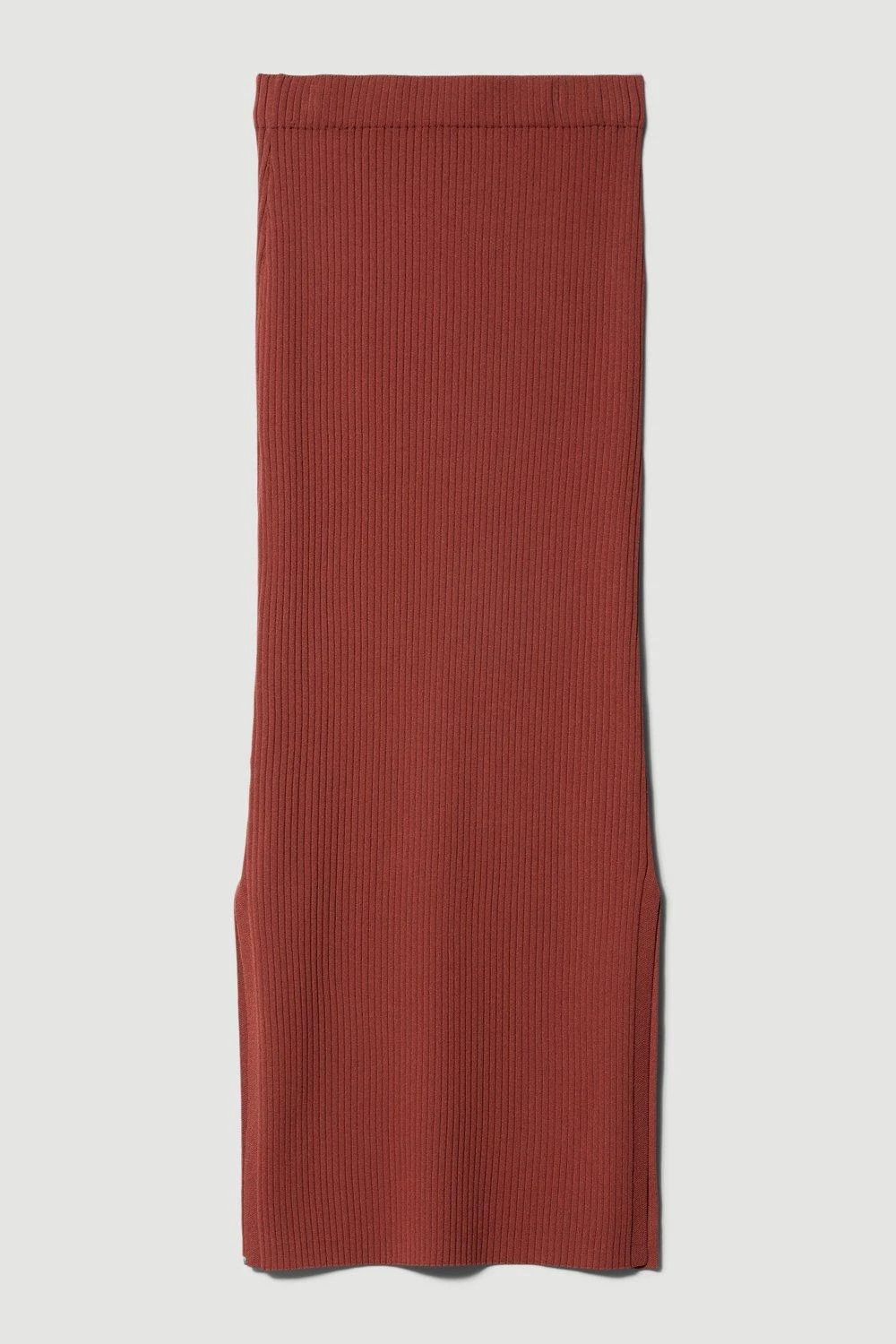 This minimalist feminine style promises to be a year-round staple. Draping down to an ankle-grazing length, this elegant knit skirt creates a streamlined silhouette. Style with heels and the co-ordinating knit top for a sophisticated ensemble, or trainers and cropped blouse for a laid-back look.