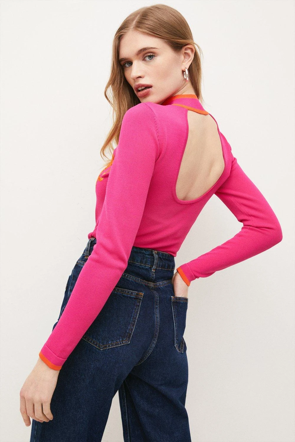 Layers of intricate lace blooms add rich textural appeal to this slinky knitted top. Blending a high, sporty neckline with long sleeves and a form-fitting silhouette, it instantly enlivens indigo denim. Spin around to show off the unexpected back cut-out – a daring detail that takes this versatile knit from stylish to sultry in seconds.