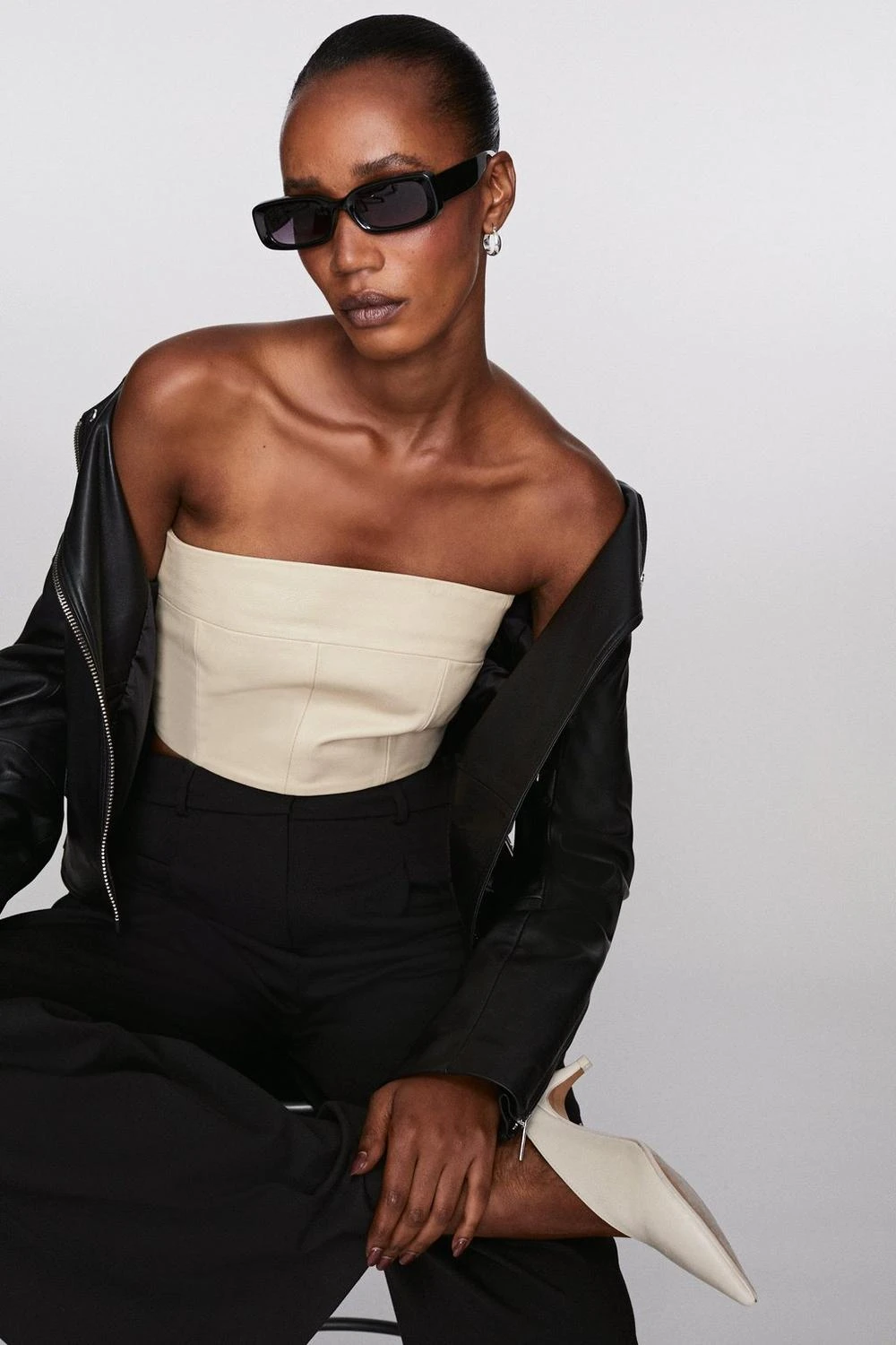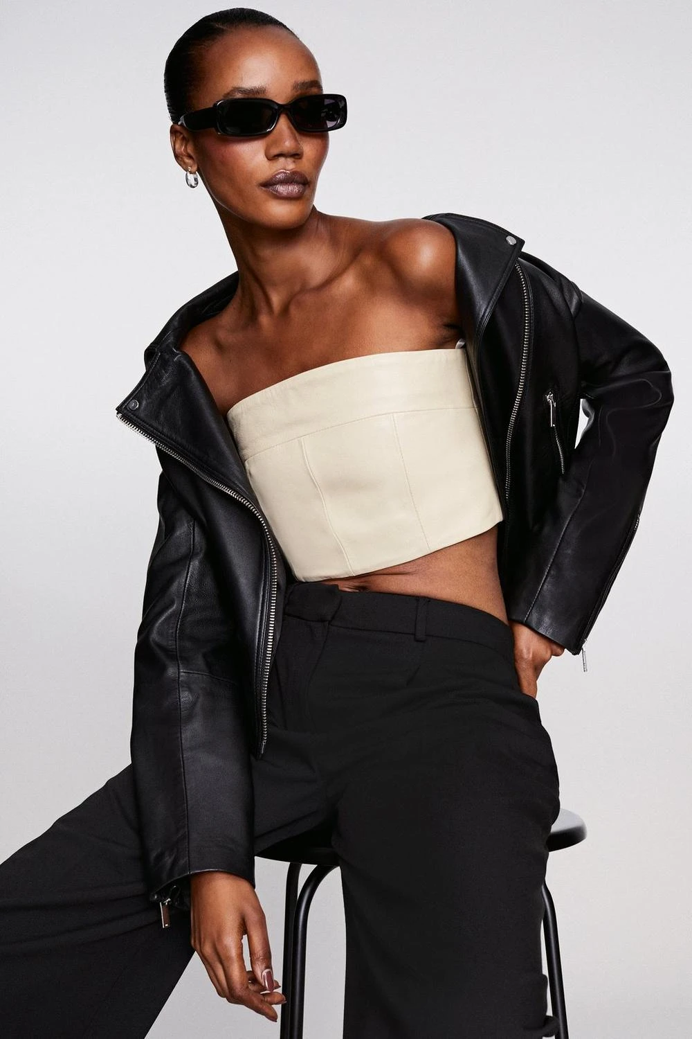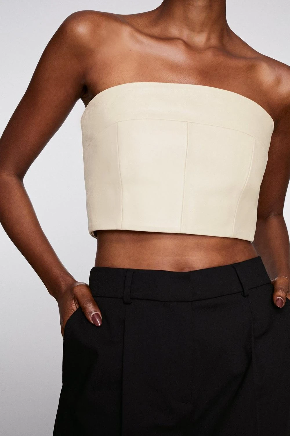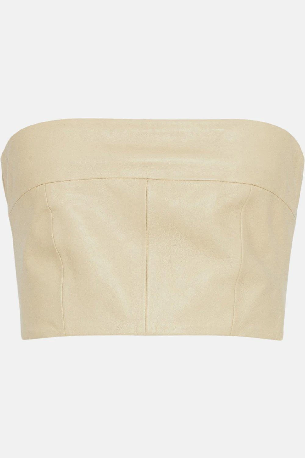 An elevated sartorial staple, this leather bandeau top can be worn on its own or layered underneath a leather blazer for an impactful look. The top features subtle corset boning, which softly sculpts the silhouette.