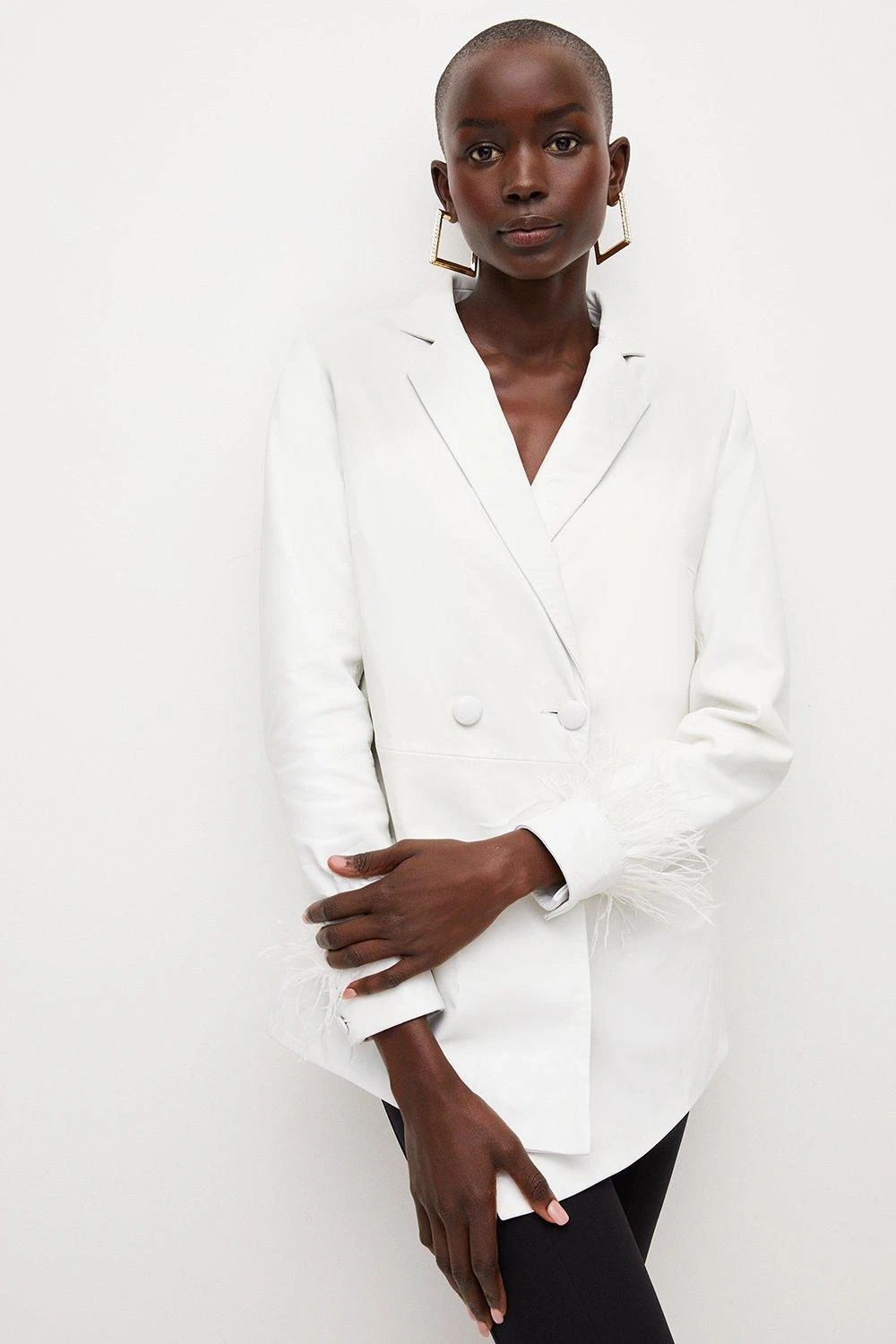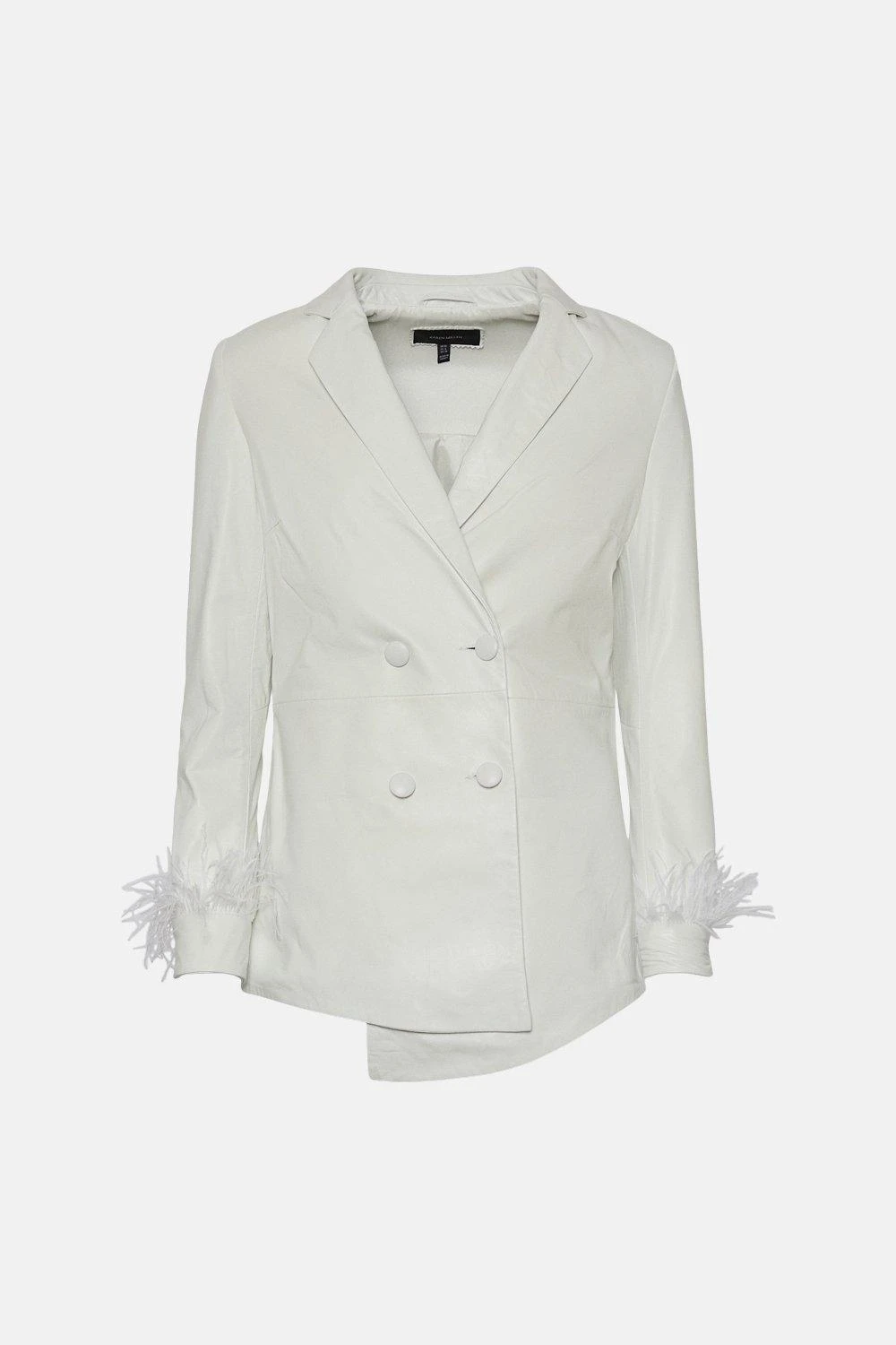 Leather and feathers combine with flamboyant effect on this covetable longline blazer. Detailed with traditional trims ? notched lapels, double-breasted buttons and a sleek, androgynous fit ? this luxe design is perfect for parties. Accentuate the feather-trimmed cuffs with a sparkling cocktail ring or chunky chain-link cuff.