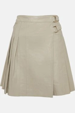 Preppy meets polished. Crafted from butter-soft leather, this pleated mini skirt is inspired by a classic kilt, featuring double D-ring buckles framing the side and a feminine, swishy shape. A premium piece with endless pairing potential, style it with sporty ribbed separates for a modern take on the mini skirt trend.