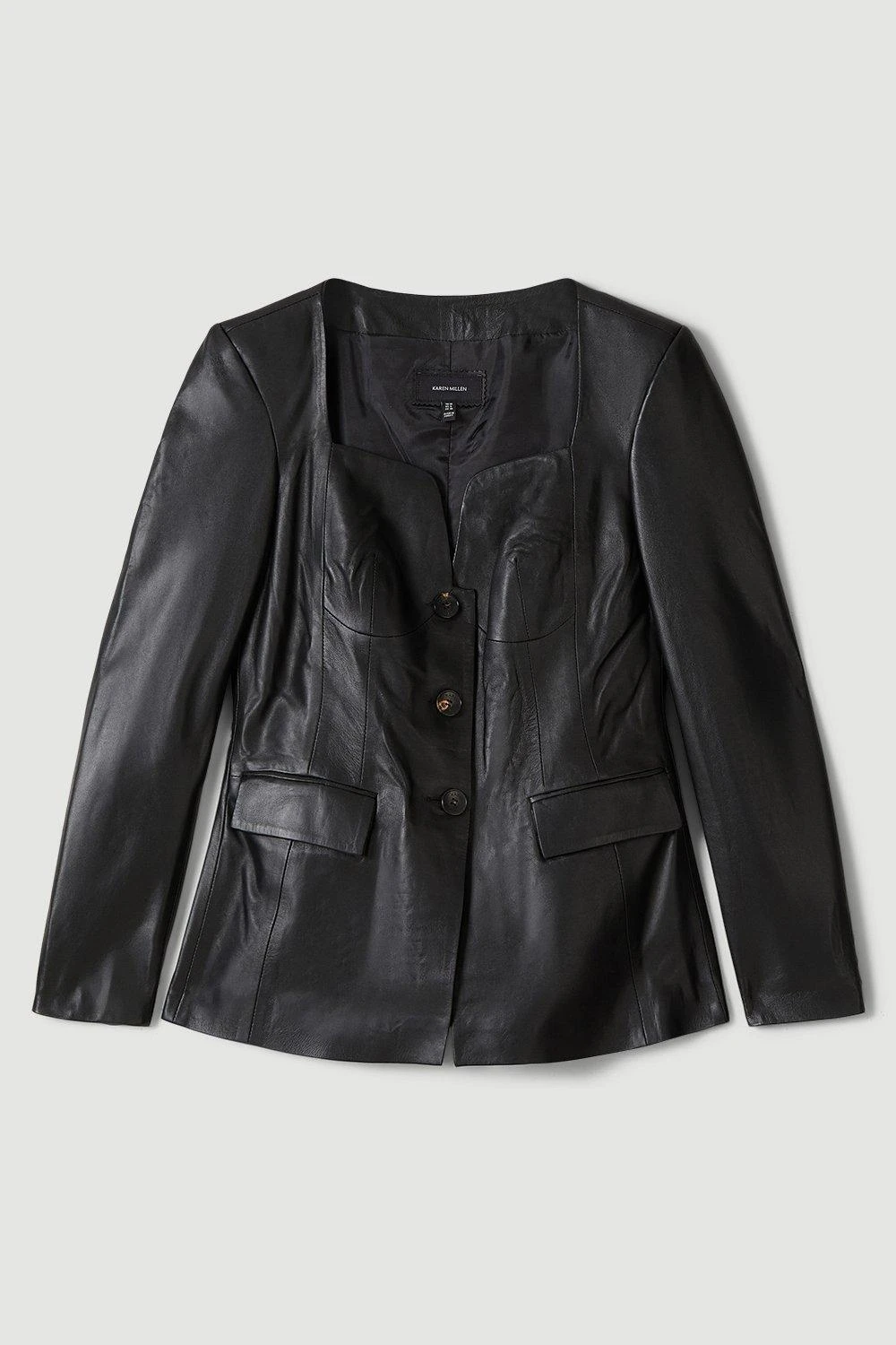 Crafted with modern majesty, this top has a tactile leather construction that artfully frames the form. Balancing a notched square neckline with the voluminous proportions of a peplum hem, pair this piece with streamlined jewels.