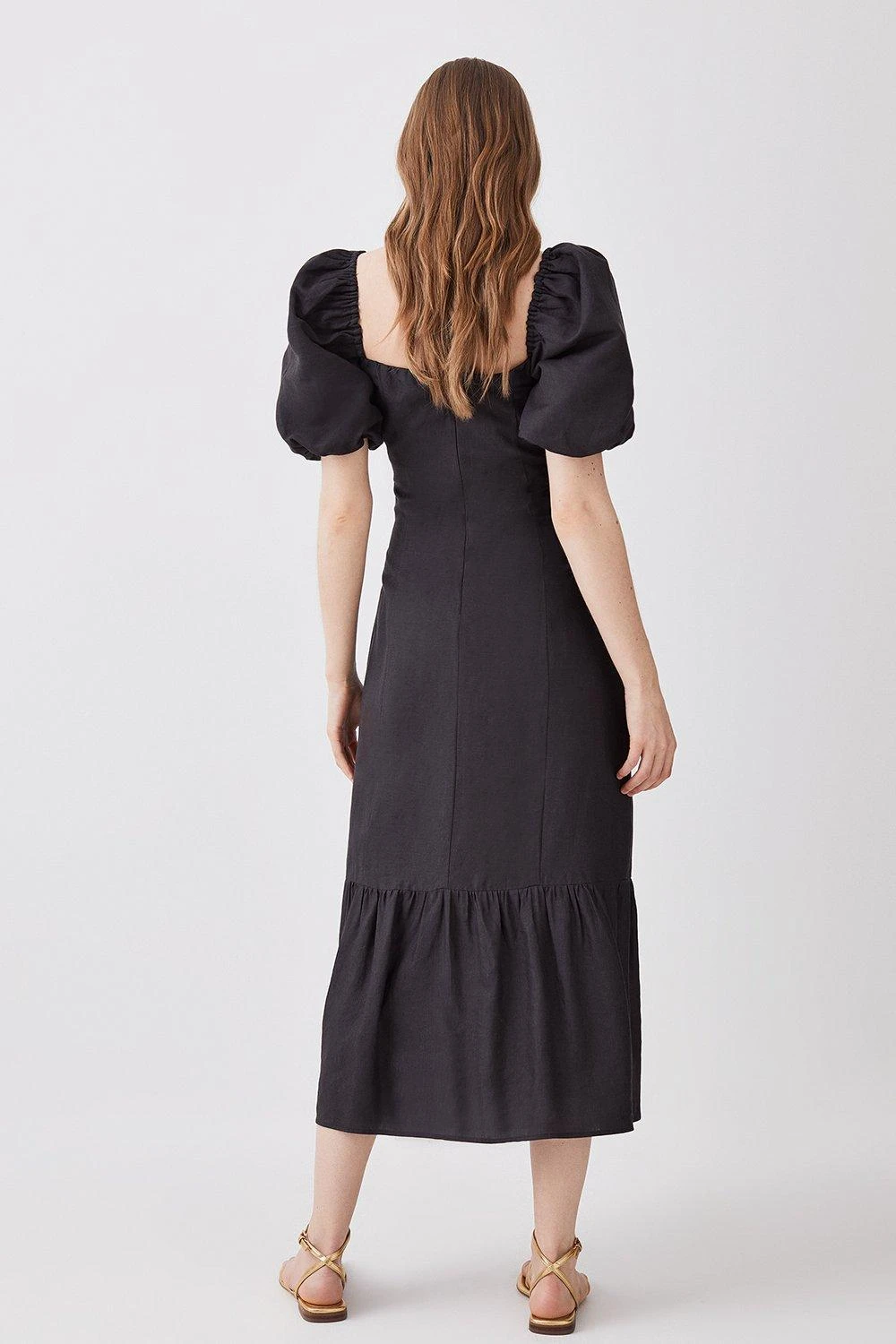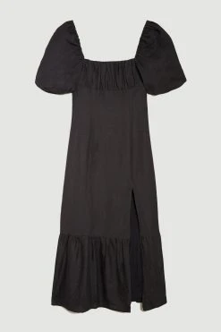 With an emphasis on living la dolce vita, this midi dress is the epitome of summer romance. This classic silhouette is emphasised with large puff sleeves and a sultry leg slit. A ruched bodice adds feminine allure. Whether having dinner and cocktails by the beach or a stroll in the park, this dress delivers elegance on every occasion.