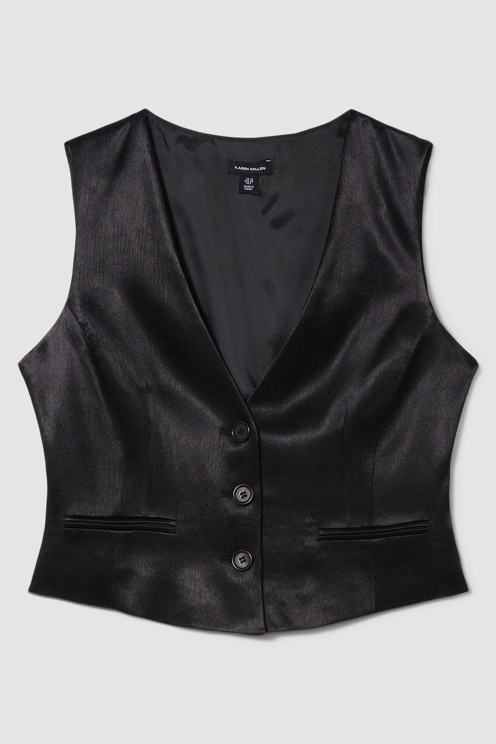Marrying a borrowed-from-the-boys aesthetic with luxurious satin material, this waistcoat delivers elegance on every level. Cut with a deep neckline and cropped silhouette, this piece exudes enviable sophistication.
