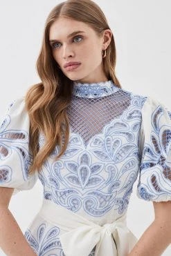 Detailed with opulent cutwork, this midi dress exudes artisanal appeal. Puff sleeves add a touch of drama, while a bow-detail belt and high neck exude classic appeal. Crafted with lightweight twill material, this piece makes an elevated choice for summer soirees. A scalloped hemline adds a feminine finish.