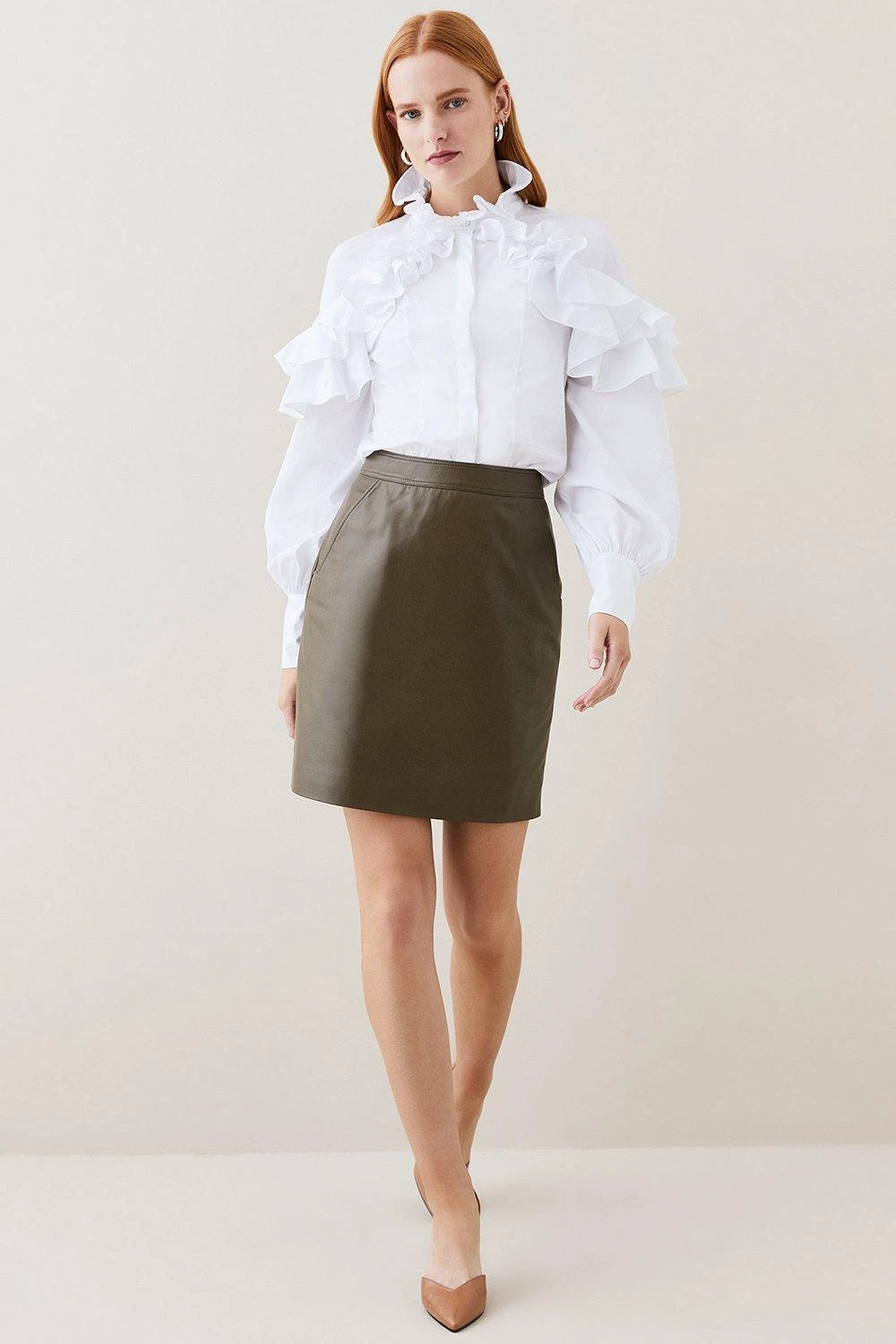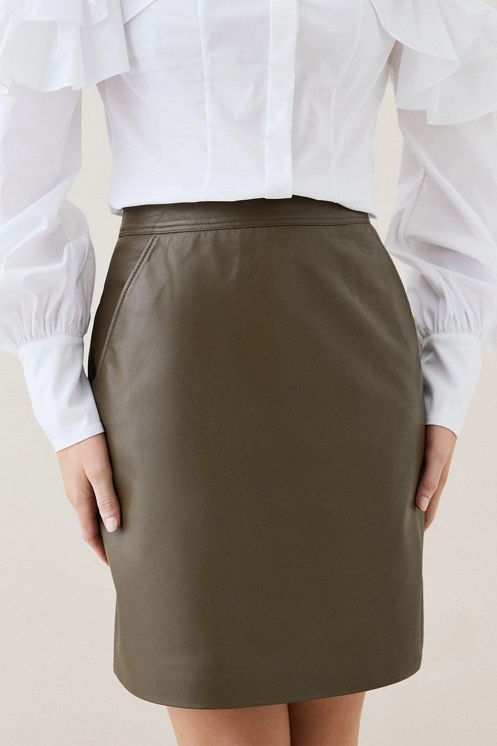 An iconic staple with timeless appeal, this leather mini skirt is an essential addition to your capsule wardrobe. A high waistband and A-line silhouette ensure a flattering fit, pair this piece with knee-high boots and a jumper to achieve an autumnal aesthetic, or choose heels and a blouse for an elevated look.