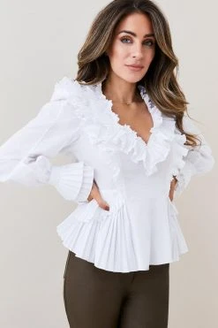 Merging a bohemian mood with classic tailoring, this blouse adds feminine allure to any ensemble. A peplum hem creates a flattering hourglass shape, which effortlessly enhances the silhouette, while pleated details upholds a vintage aesthetic. The V-neckline is adorned with pleated ruffle details which make an undeniable style statement. Style this blouse with slim-fit trousers to complete the look.