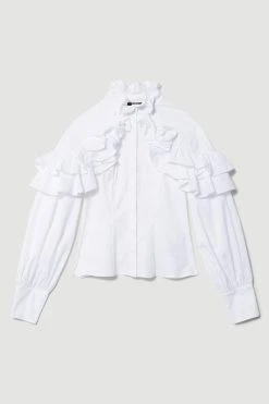 Embrace a vintage charm with this elegant ruffled blouse. Featuring intricate ruffled details which extravagantly flare out by the shoulders, this balloon sleeve blouse makes an unforgettable addition to your smart-casual wardrobe.