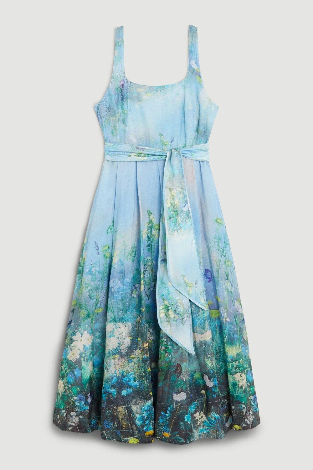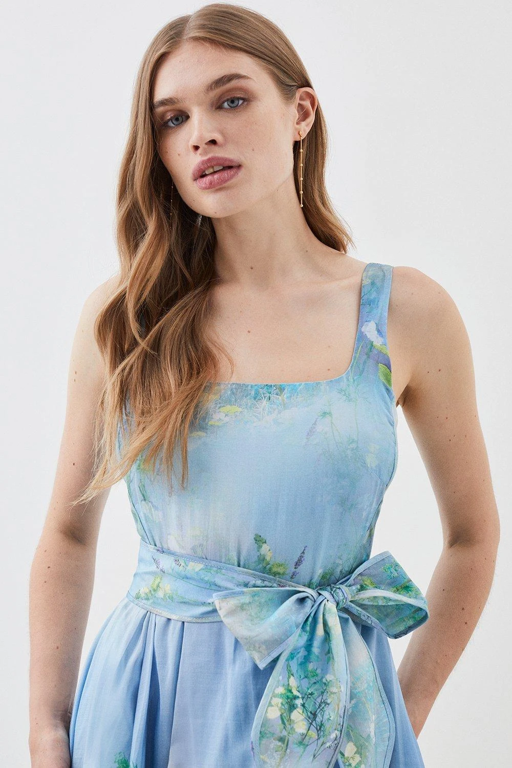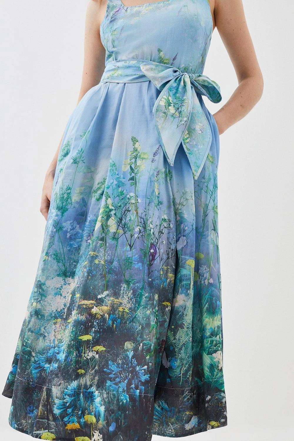 Enriched with serene blue shades and an idyllic floral print, this A-line dress exudes undeniable elegance. This piece is crafted with a luxurious cotton-silk blend, giving it a soft feel. Style with heels and accessories to make an unforgettable impression and upcoming special occasions.
