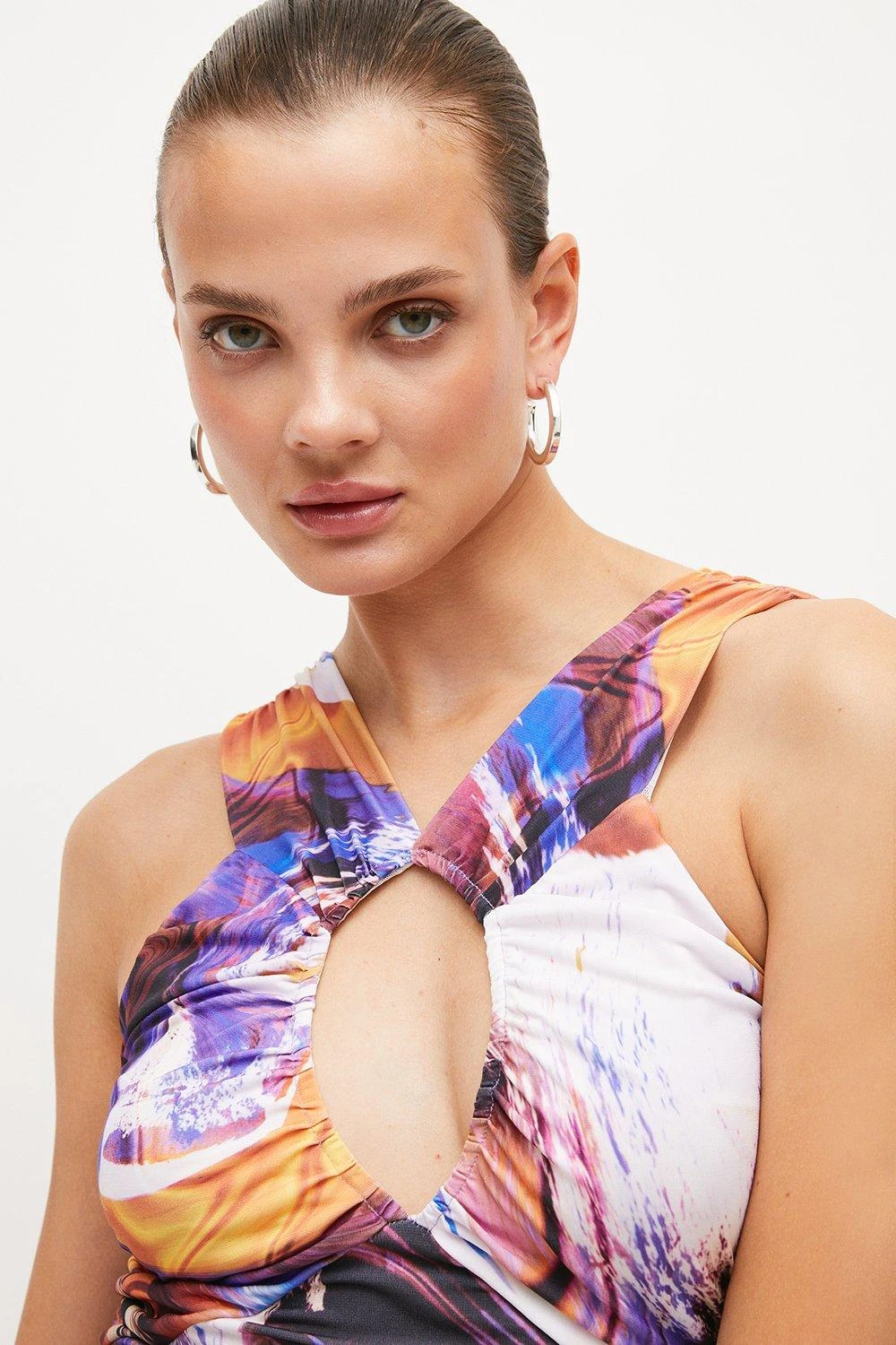 Reach for this stretchy jersey crepe top to inject an instant dash of colour to any look. It shows off a unique front cut-out and thick shoulder straps that frame the figure beautifully, complemented by a swirling marbled print that feels effortlessly on-trend for SS22.