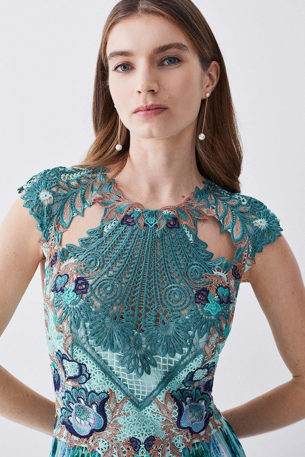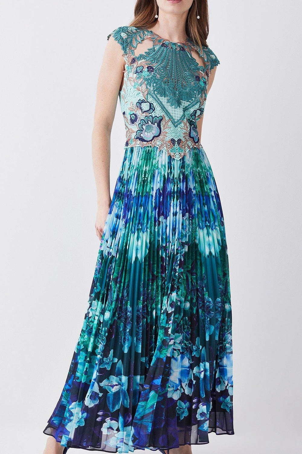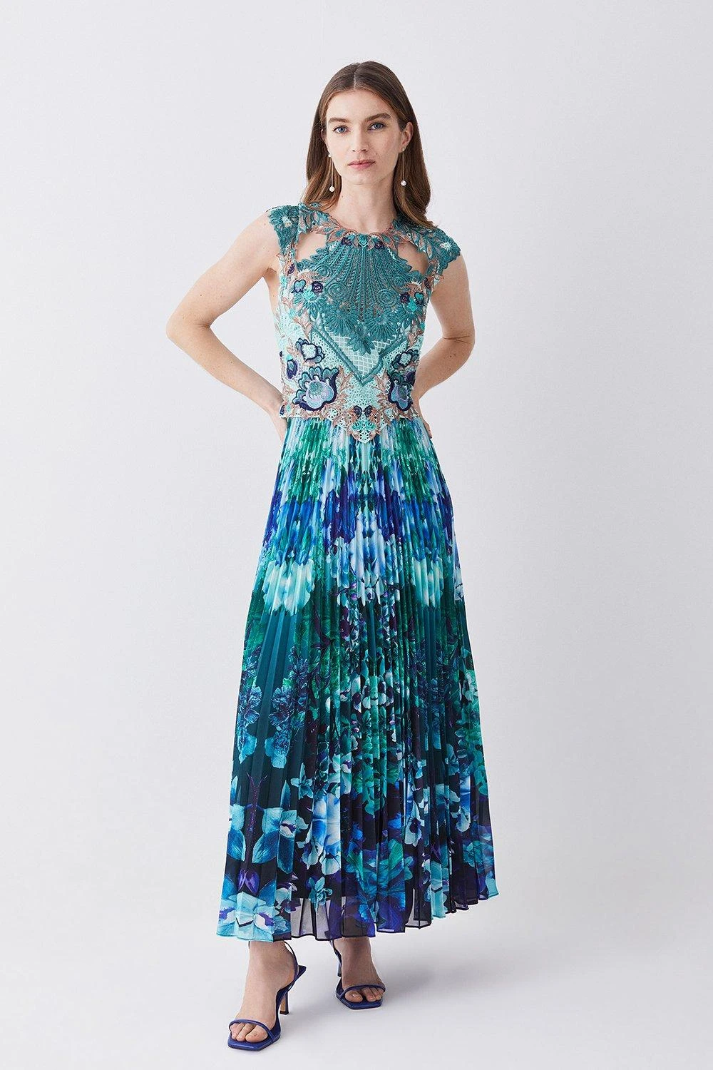 Crafted with opulent guipure lace, this pleated midi dress is the epitome of elegance. The bodice is adorned with applique floral details, adding an undeniably feminine touch. Soft pleats fall down to the ankles, showcasing a mesmerising floral print and captivating ocean blue hues.