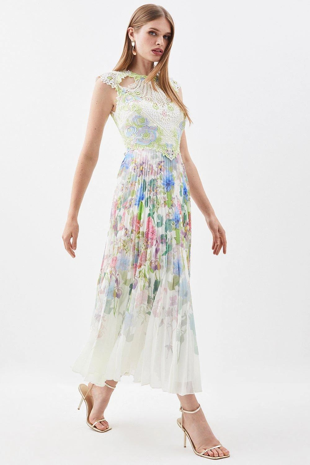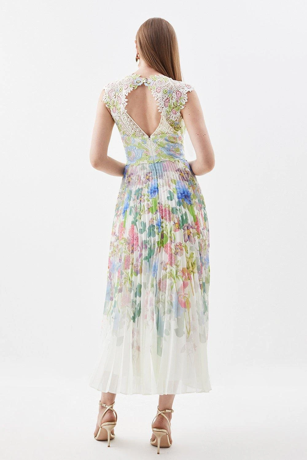 Karen Millen Metallic Guipure Lace Placed Floral Pleat Midi Dress