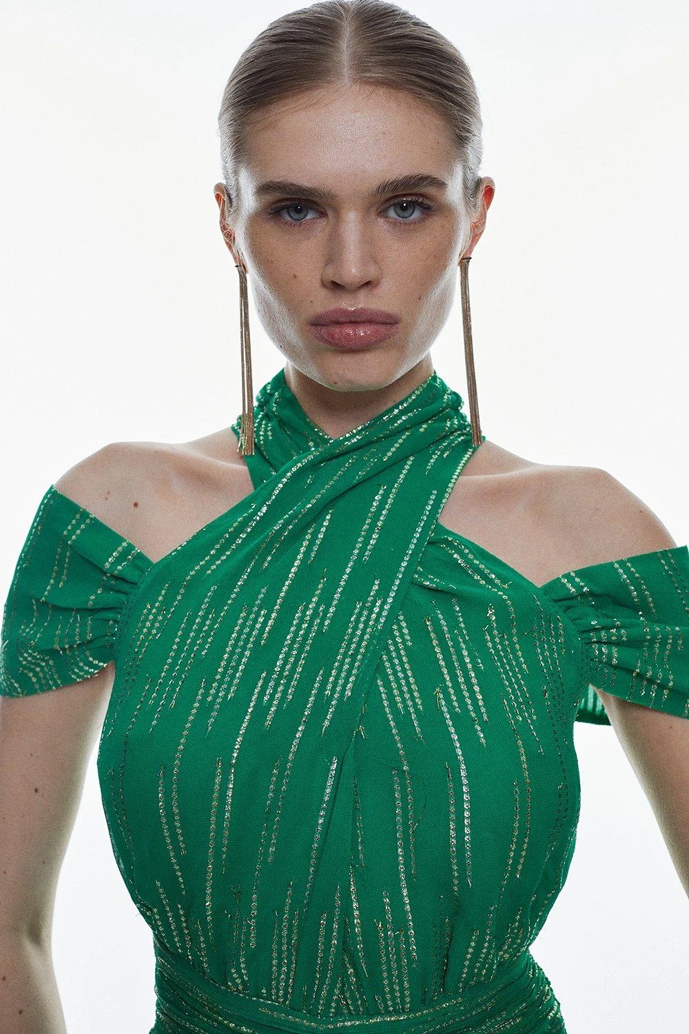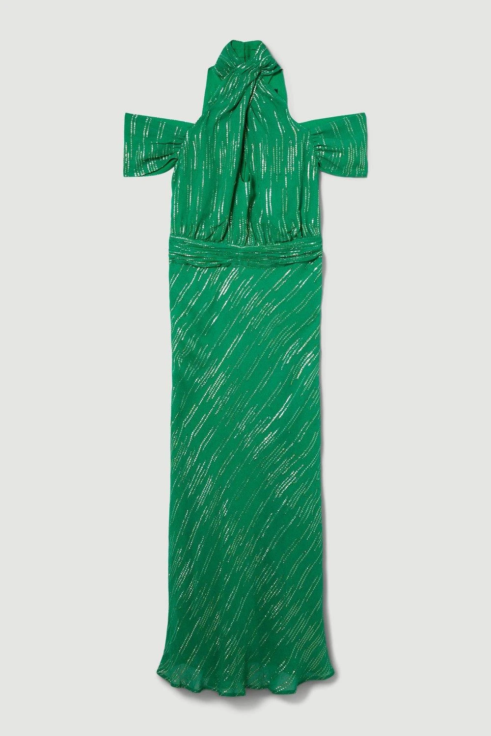 ain:94% Viscose/ Rayon, 6% Metallised fibre/ Metallic fibre, Lining 100% Polyester. Cool iron on reverse, Do not bleach, Do not tumble dry, Hand wash inside out. Model wears UK 8. Centre back length 140cm.