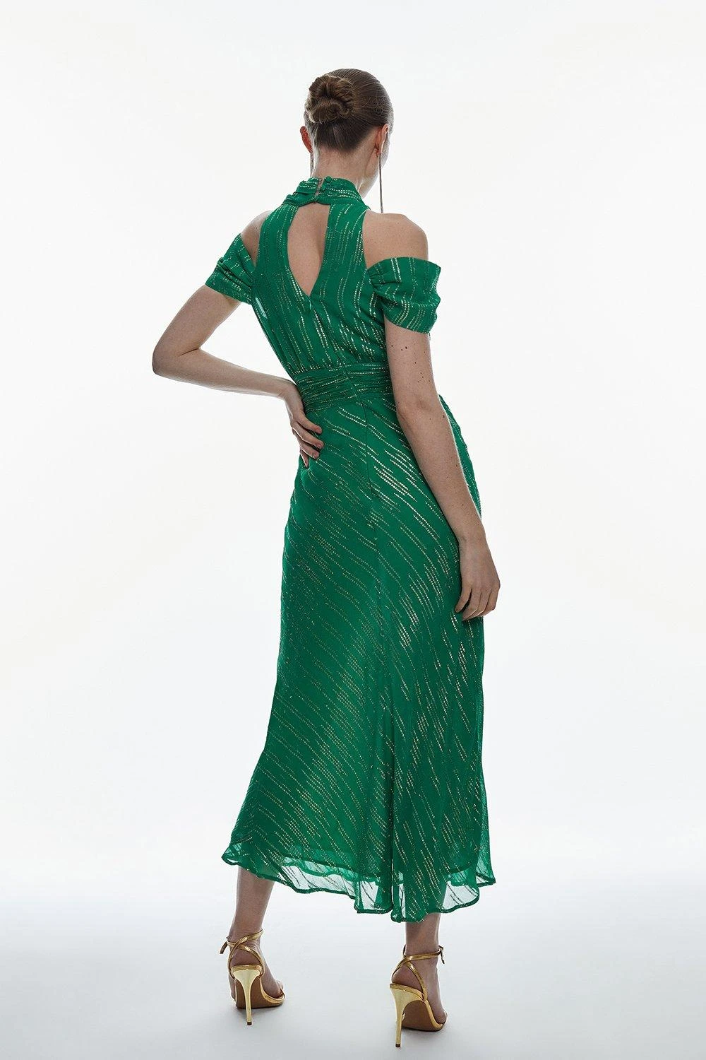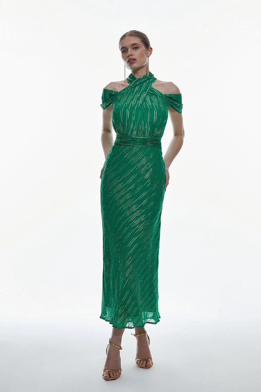 Detailed with iridescent details, this midi dress showcases a subtle shimmer. An off-the-shoulder design adds an alluring touch, while lightweight fabric elegantly flows down to a midi hemline.