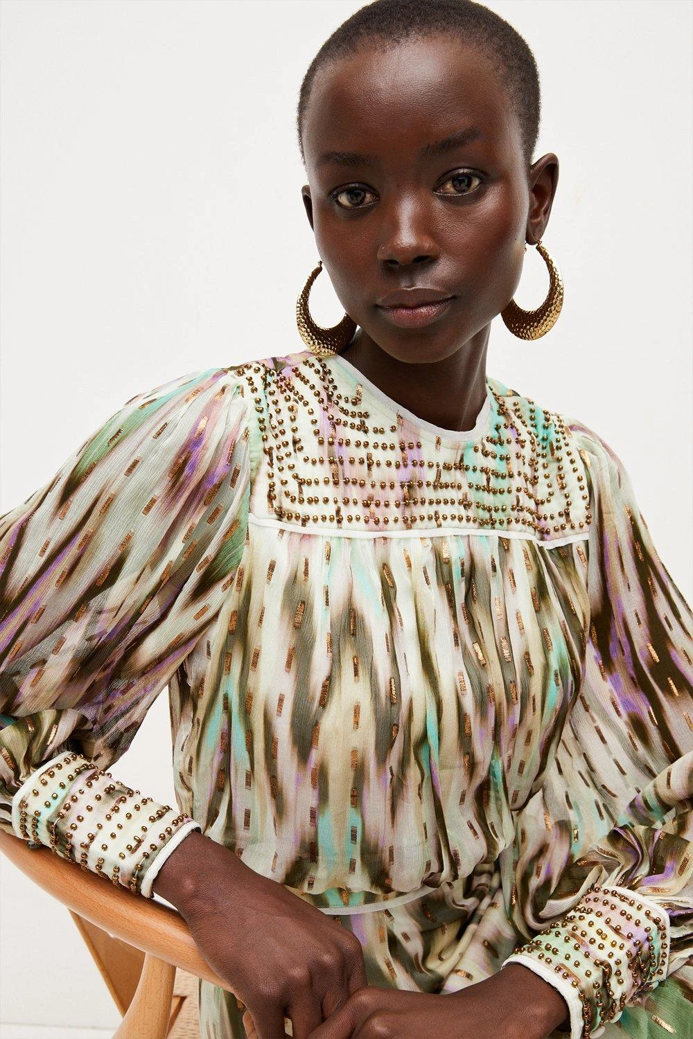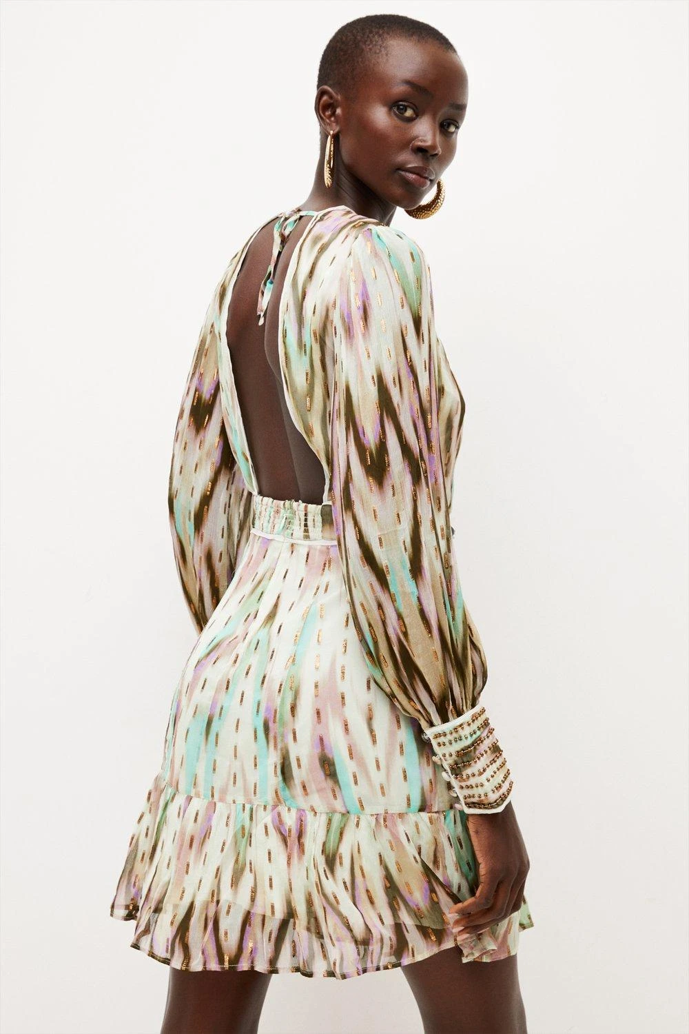 Exuding textural allure, this boldly printed mini dress marries a stylish metallic-flecked motif with Grecian-style metallic beading. It shows off semi-sheer sleeves with gathered cuffs, a cinched-in waist and swishy hemline. Perfect for summer styling, contrast the opulent beads with all-black accessories and statement gold jewellery.